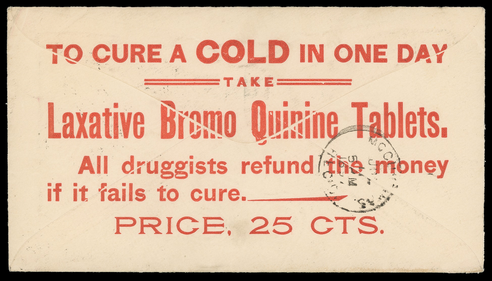 s.e., canceled by blue "6" circular grid duplexed with "Cincinnati O. Oct 26" cds to Philadelphia Pa., receiving backstamp, pencil 1878 dating on reverse; reduced slightly at right, Very Fine and scarce medical ad. Estimate; $150 - 200. (Image1)