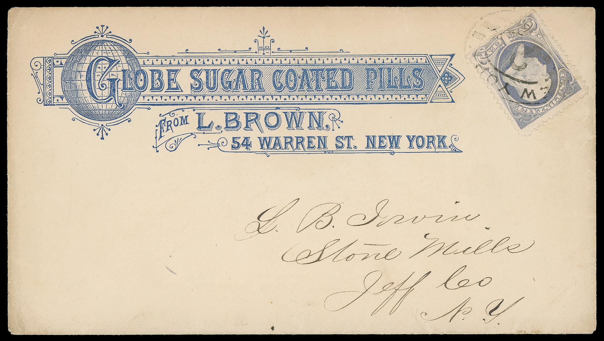 Sugar Coated Pills, L. Brown, New York N.Y. Ornate blue advertising on unsealed cover bearing 1¢ gray blue (206) to Stone Mills N.Y., Very Fine and attractive. Estimate; $50 - 75. (Image1)
