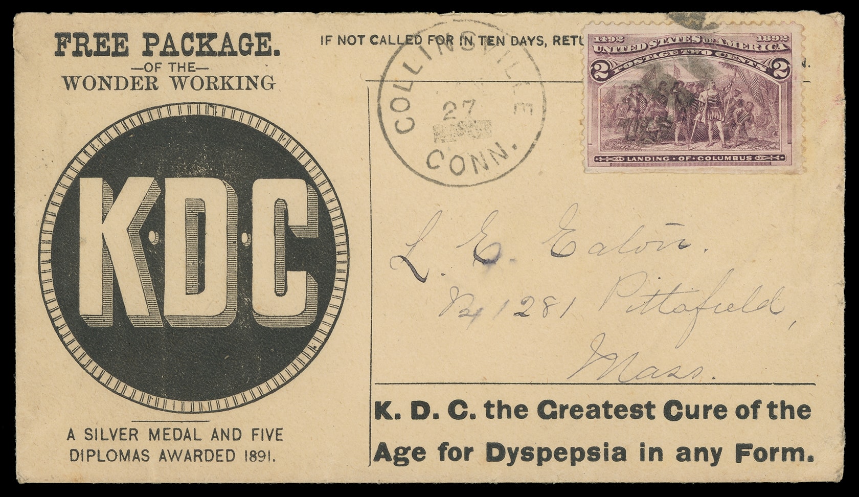 Package of the Wonder Working KDC. Illustrated advertising showing "KDC" monogram medal on amber cover bearing 2¢ Columbian (231) tied by segmented cork duplexed "Collinsville, Conn. Jan 27" cds to Pittsfield Mass.; stamp with