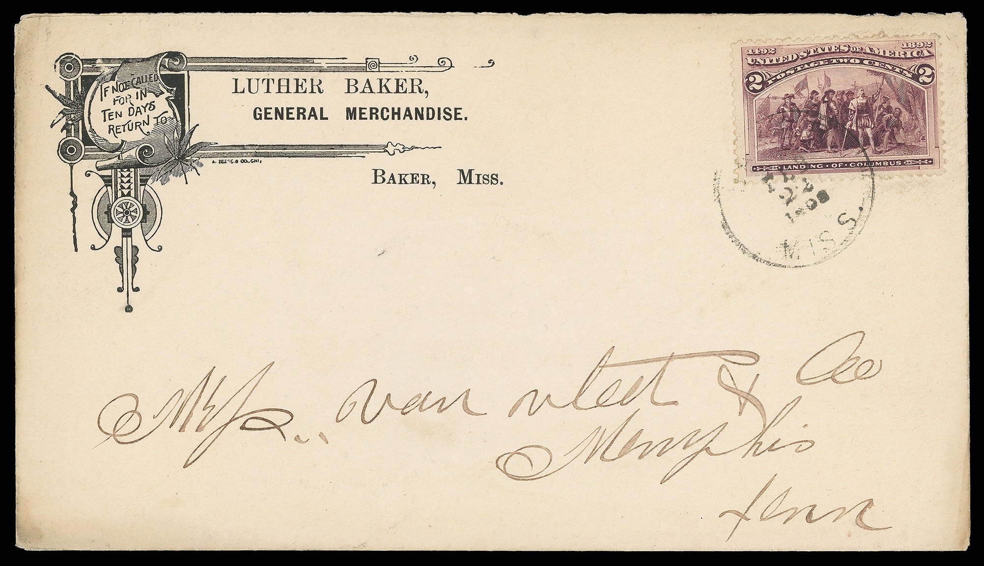 Thatcher's Liver and Blood Syrup (and other medicines). Overall advertising on reverse of cover with illustrated printed "Luther Baker, General Merchandise, Baker, Miss." corner card bearing 2¢ Columbian (232) tied by "Baker, Miss.