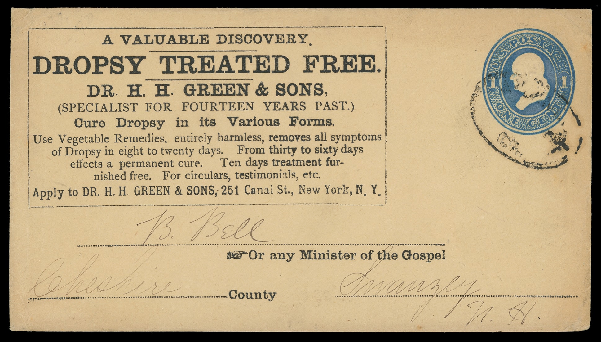 Treated Free, Dr. H.H. Green & Sons, New York, N.Y. Boxed advertising on unsealed 1¢ blue entire canceled by "Atlanta Ga." third-class oval to Swanzey, N.H., Very Fine. Estimate; $50 - 75. (Image1)