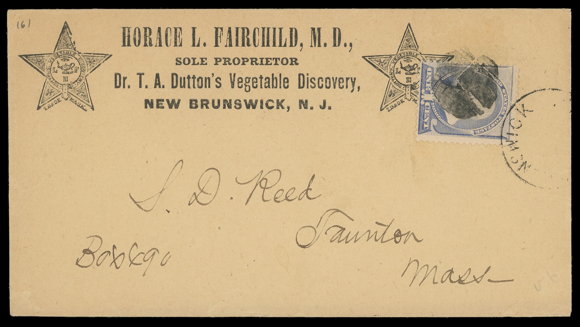 Vegetable Discovery, H.L. Fairchild, New Brunswick N.J. Illustrated advertising showing stars on unsealed buff cover bearing 1¢ ultramarine (212) tied by cork cancel duplexed with partial New Brunswick N.J. cds to Taunton Mass.,