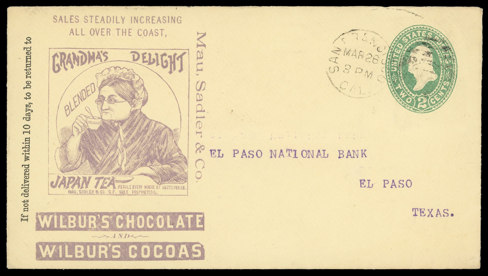 Delight Japan Tea, Mau Sadler & Co, San Francisco. Attractive purple illustrated advertising showing grandma sipping tea on 2¢ green on amber entire canceled by "San Francisco, Cal. Mar 27" duplex to El Paso, Texas; small edge tear at