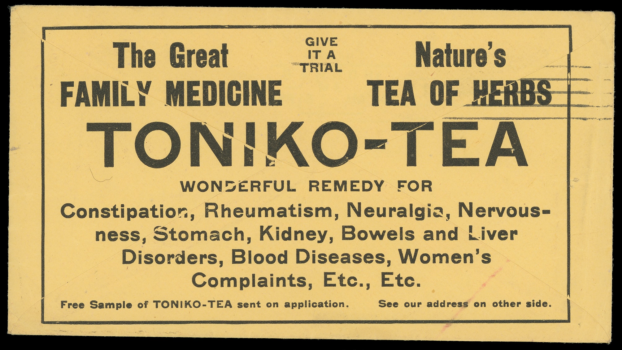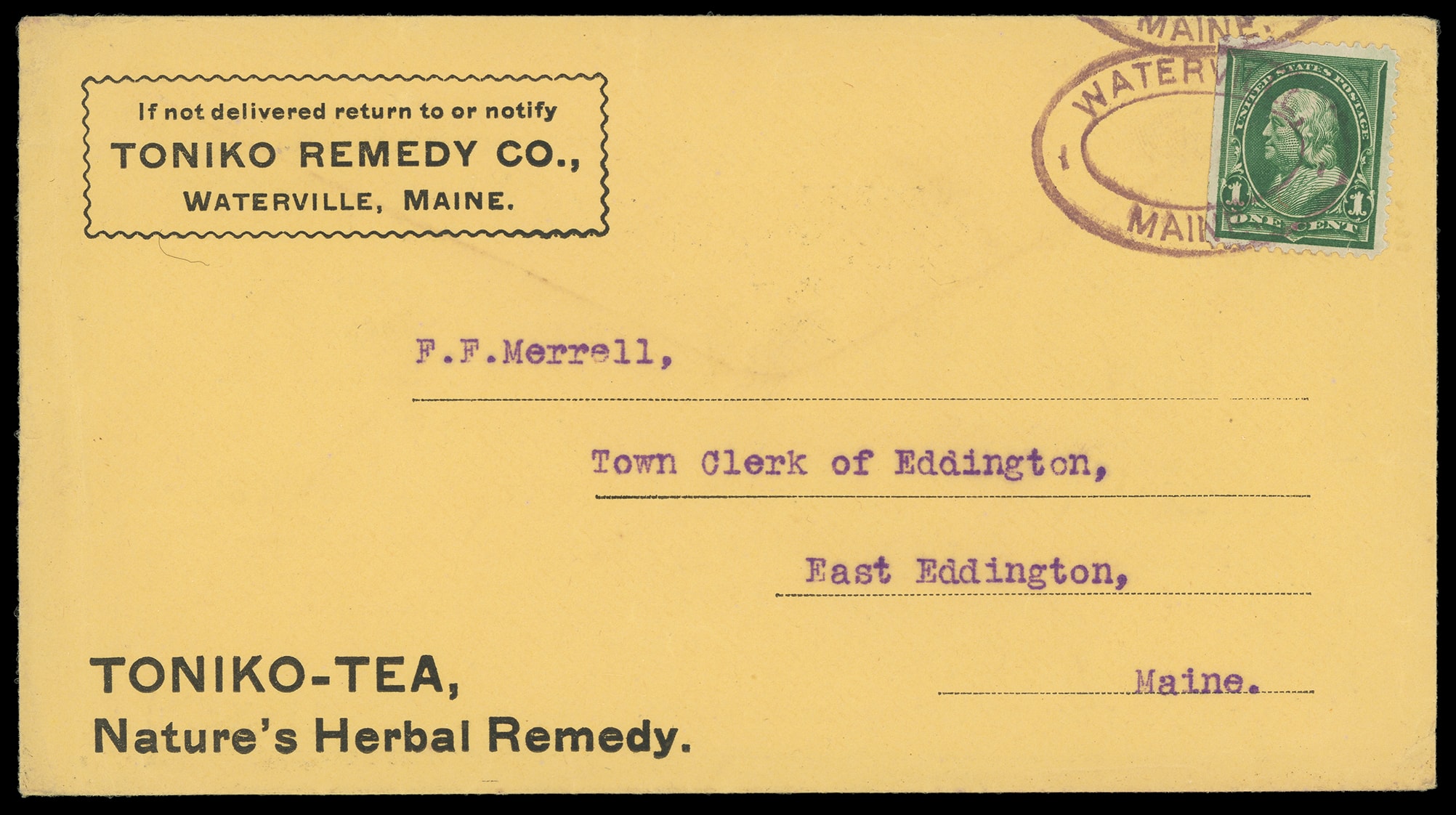 Family Medicine Natures Tea of Herbs, Toniko Remedy Co., Waterville, Maine. Overall printed advertising on reverse and additional printed boxed corner card on orange cover bearing 1¢ green (279) tied by bold purple "Waterville, Maine"
