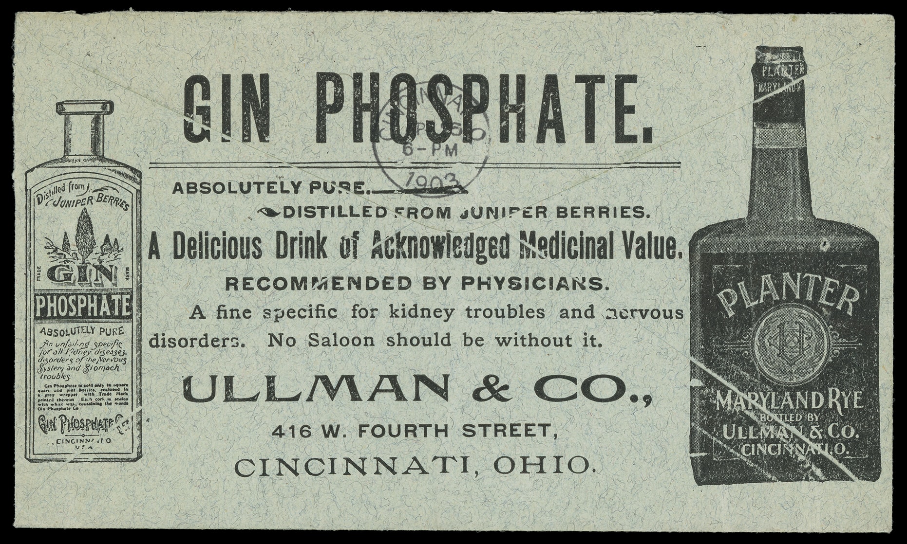 Phosphate, Planter Maryland Rye, Ullman & Co., Cincinnati, Ohio. Overall illustrated advertising with "A Delicious Drink of Acknowledged Medicinal Value" slogan on reverse of gray return cover bearing 2¢ red brown (210) tied by "Gilner Tex