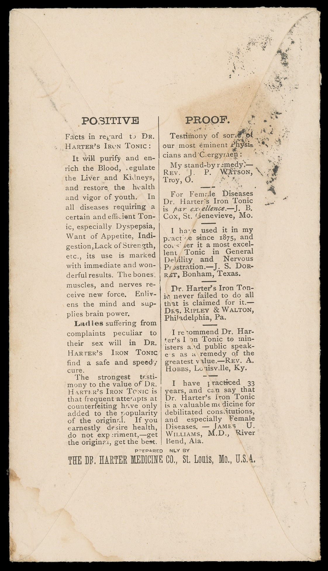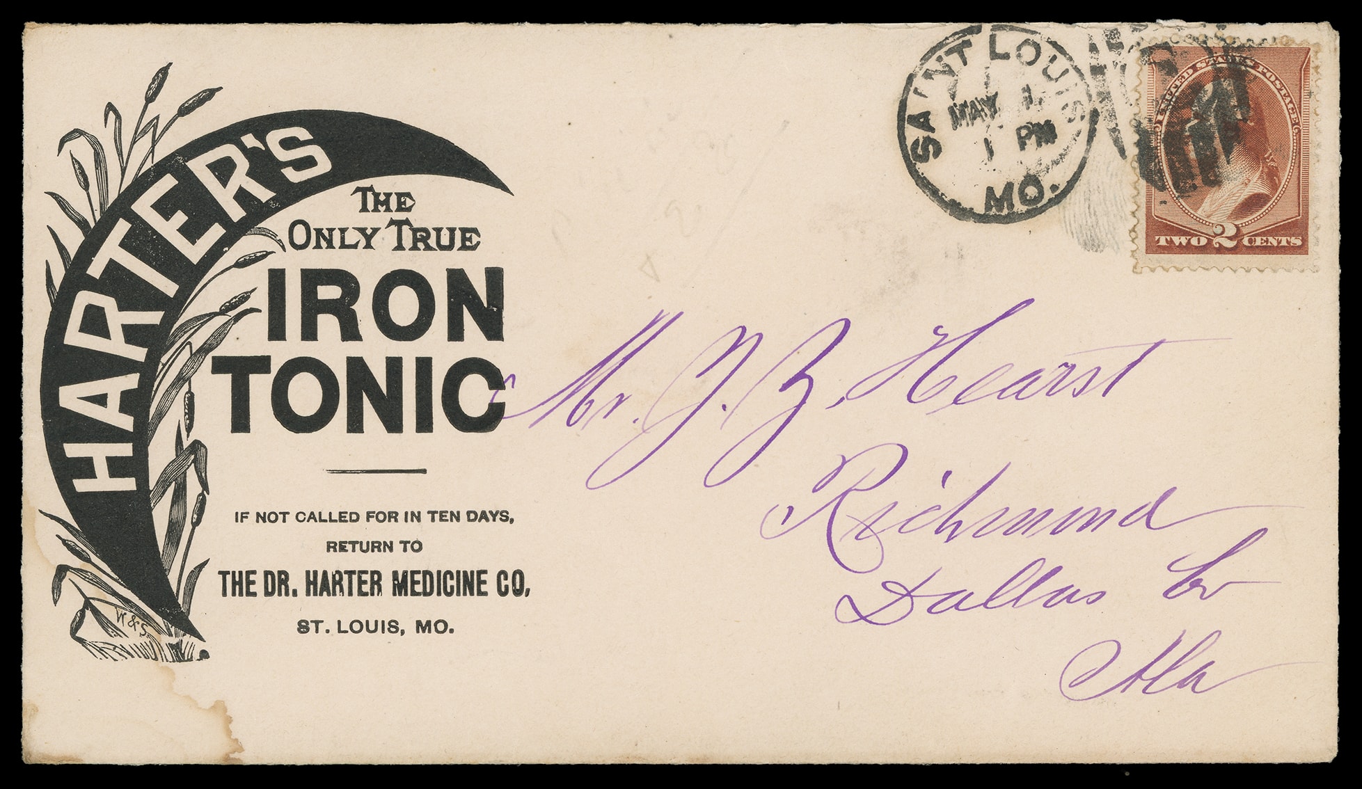 Iron Tonic, Dr. Harter Medicine Co., St Louis Mo. Illustrated advertising and overall text ad on reverse of 1886 cover bearing 2¢ red brown (210) tied by "St Louis, Mo. May 1" duplex to Richmond Ala., original matching "Harter's, The