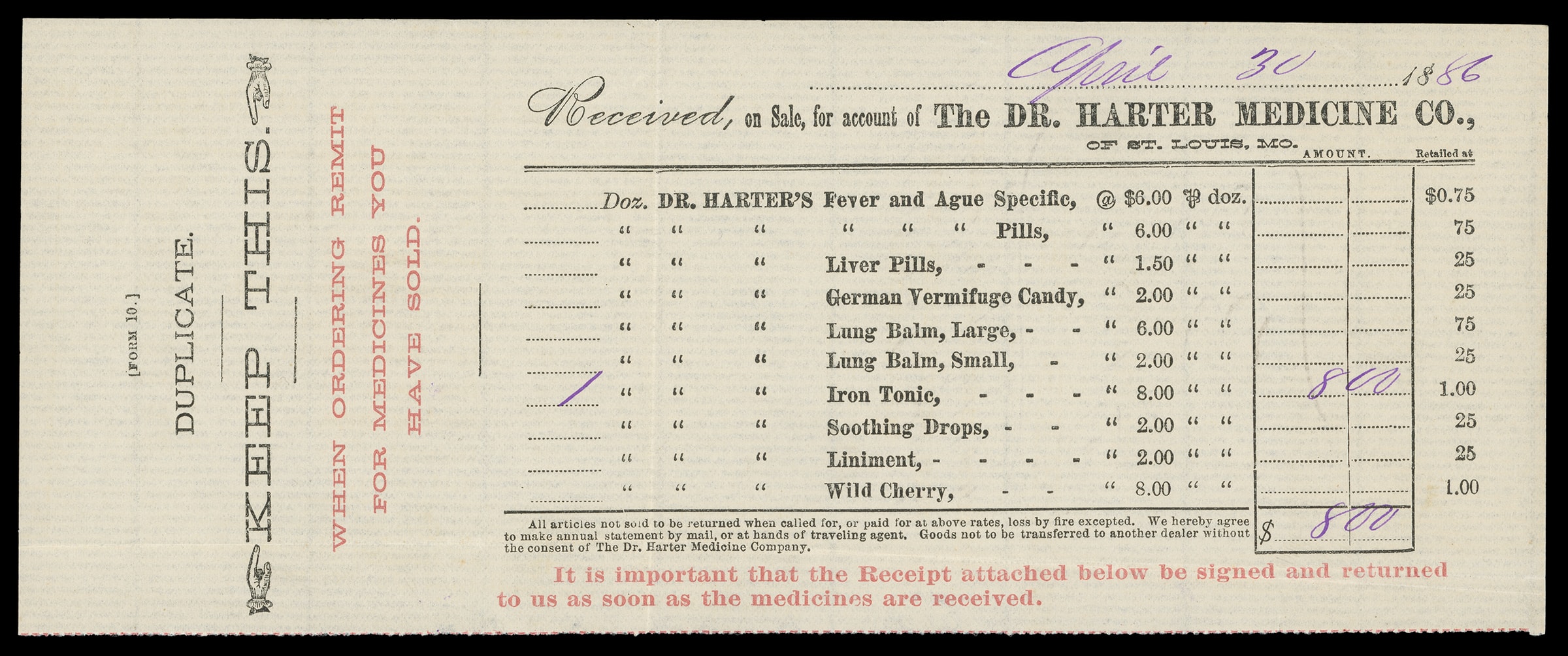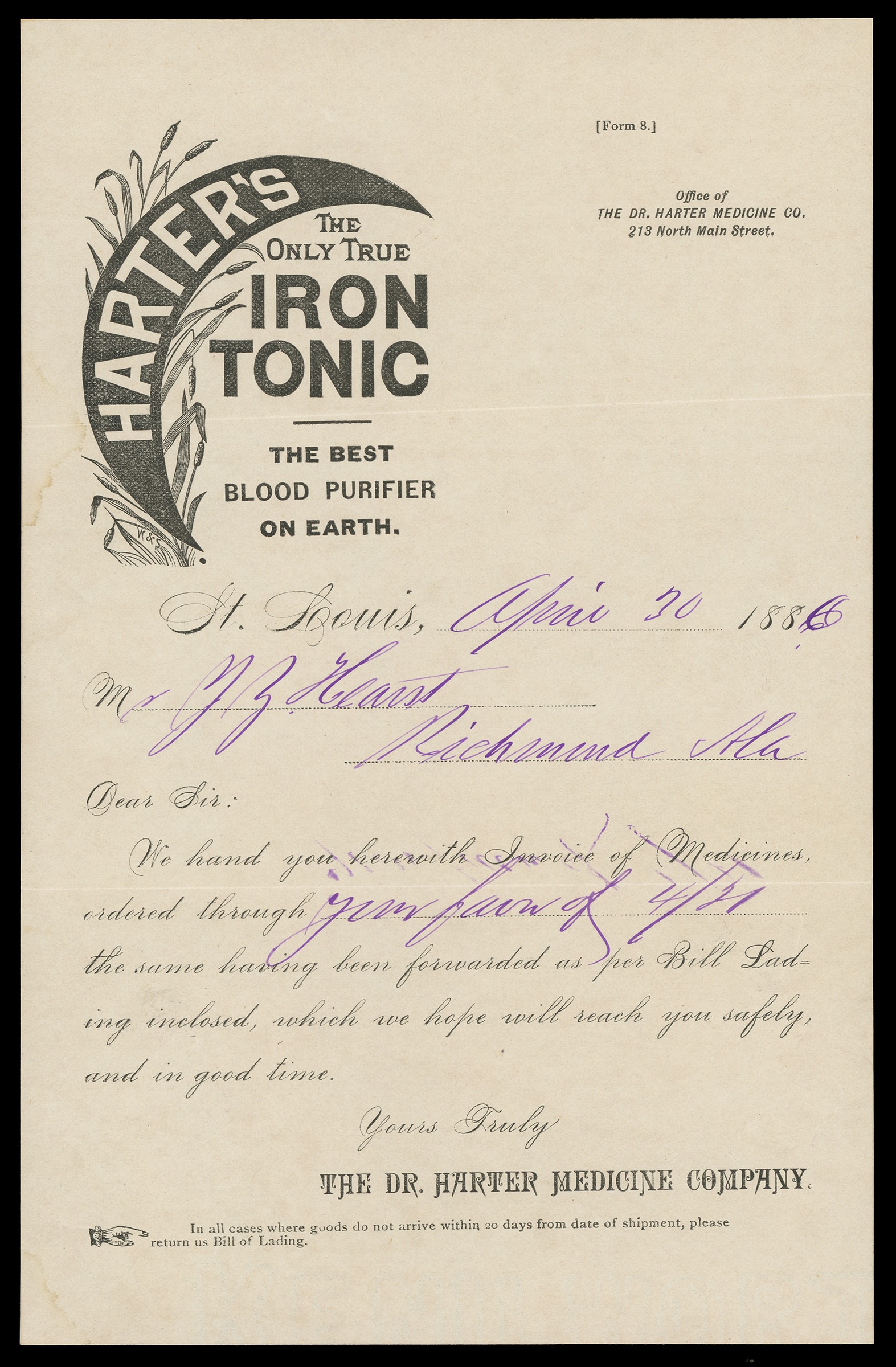 Only True Iron Tonic" letterhead enclosure and additional $8.00 receipt; light waterstain in lower left corner, still Very Fine. Estimate; $50 - 75. (Image1) (Image2)