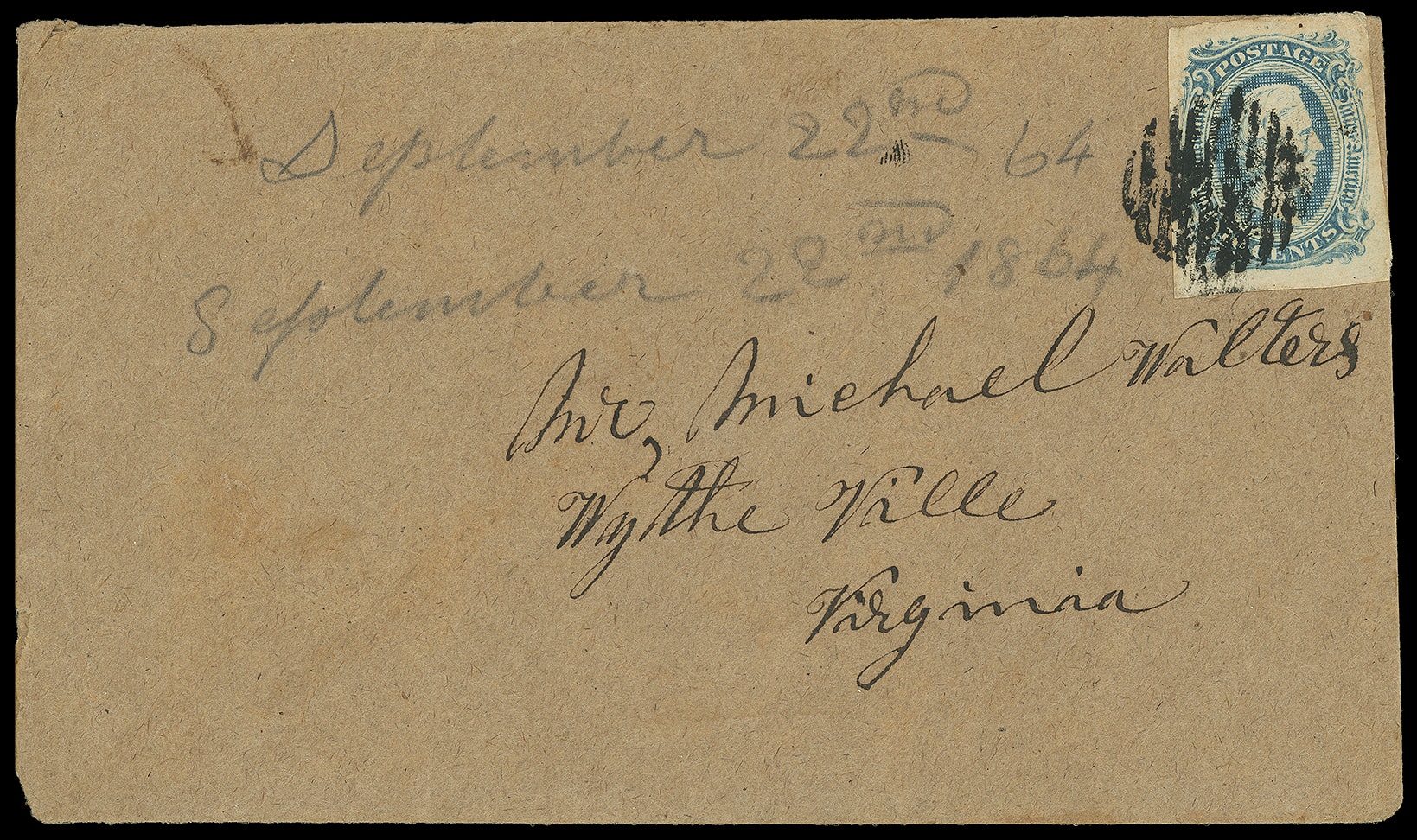 blue. Large margins, tied by Army of North Va. 10-bar circular grid (ANV-10) cancel on brown cover to Wytheville Va., pencil September 22nd 1864 docketing; barely reduced at left, Very Fine. Scott No. 11; Estimate $100 - 150. (Image1)
