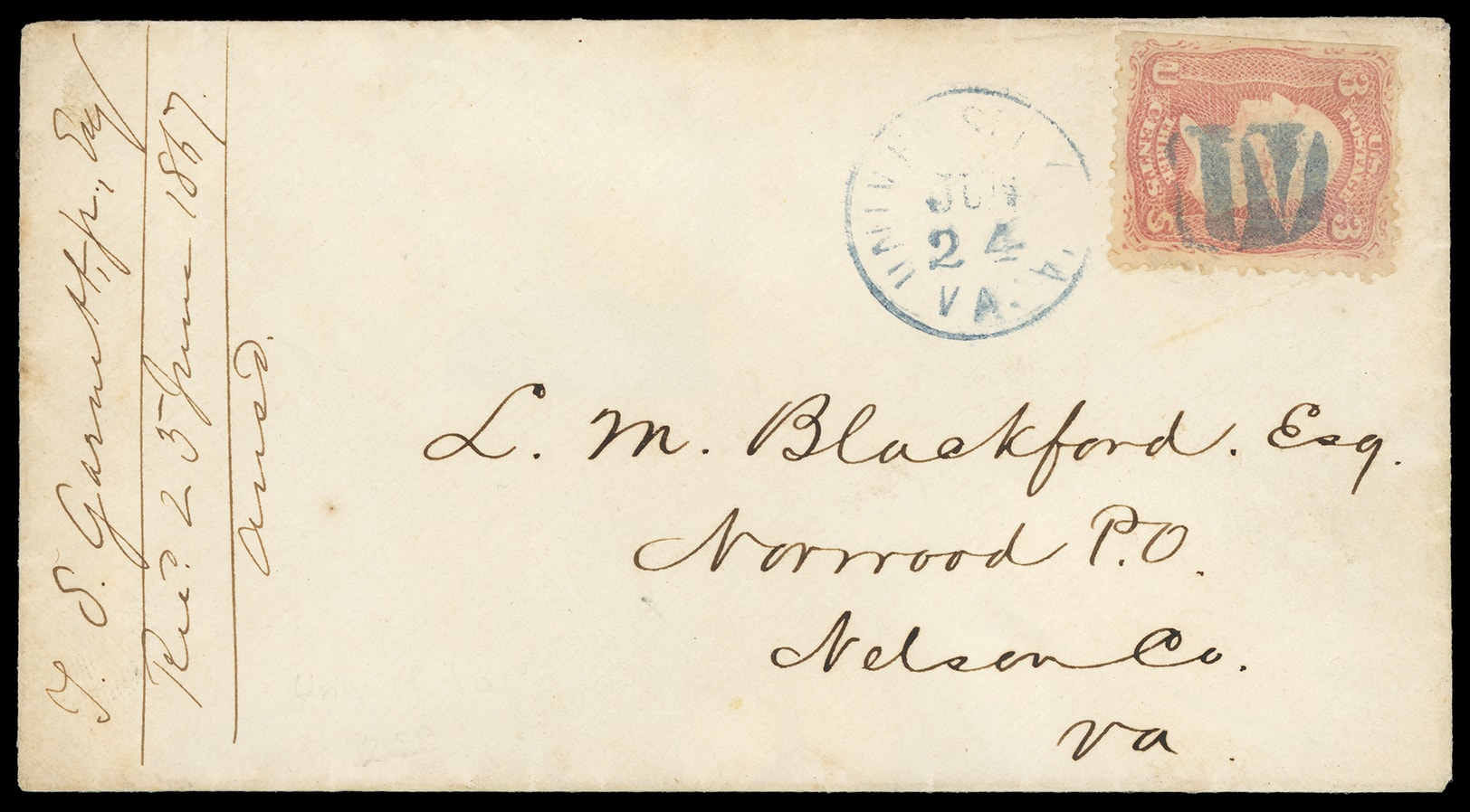 rose (65), s.e. at left, cancelled by "UV" in frame duplexed with "University of Va., Va. Jun 24" cds to Norwood Va., 1867 docketing, Very Fine pair. Skinner-Eno No. LC-U 3a, LC-U 7; Estimate $300 - 400. (Image1) (Image2)