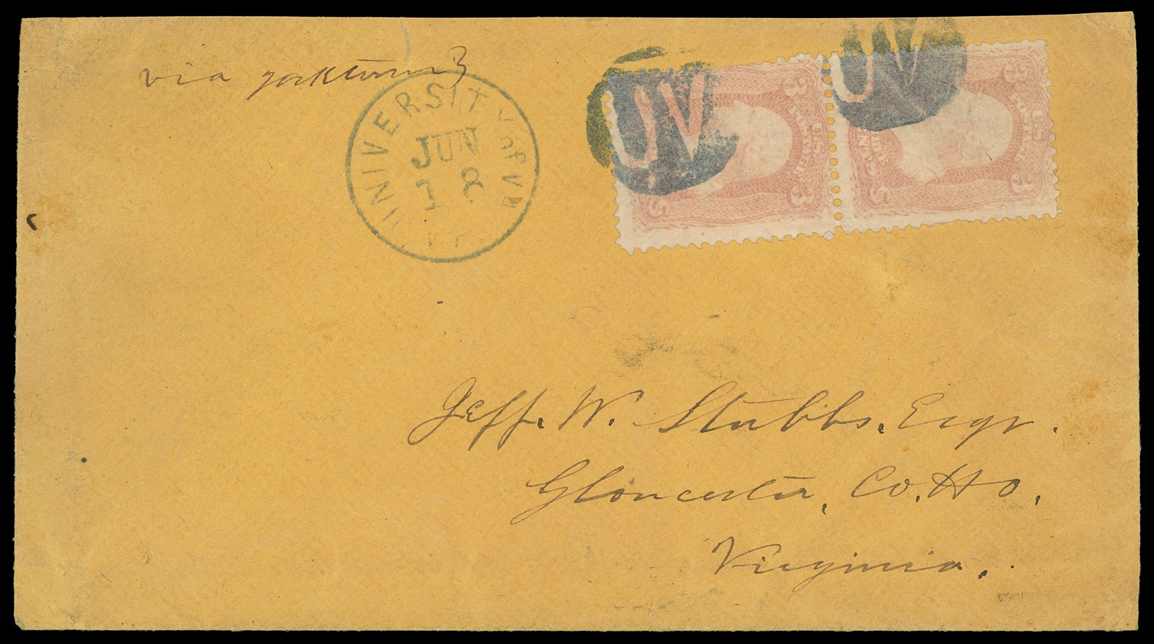 Virginia. Two different blue negative fancy cancels comprising 3¢ rose (65) pair tied by two strikes of "UV" in Circle duplexed with "University of Va., Va. Jun 18" cds on orange cover to Gloucester C.H. Va.; second with 3¢