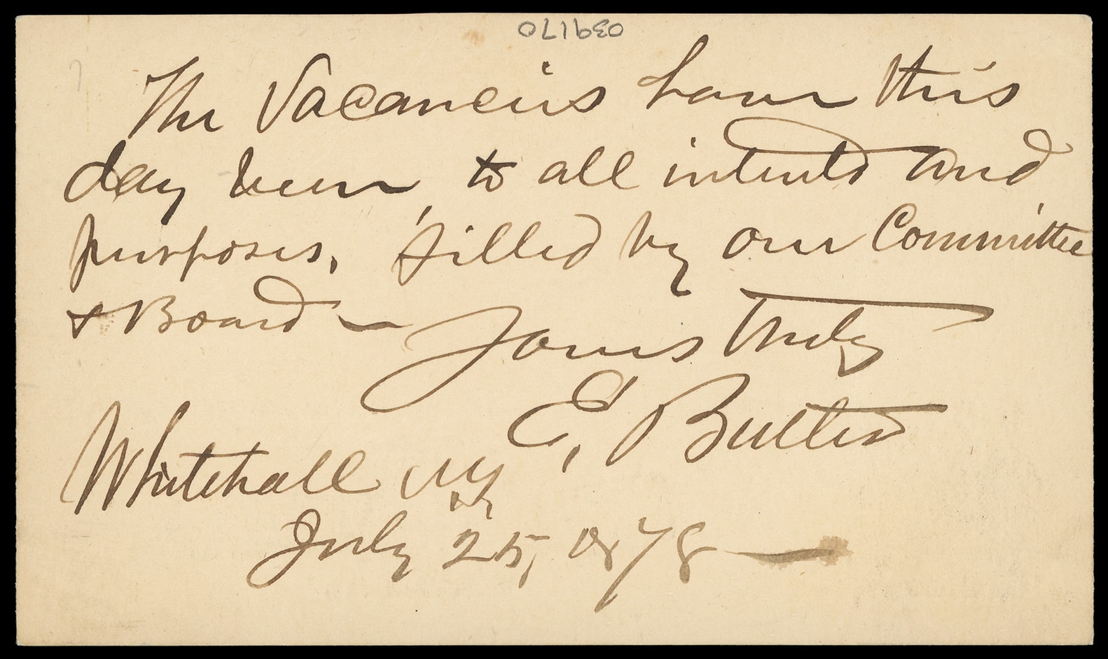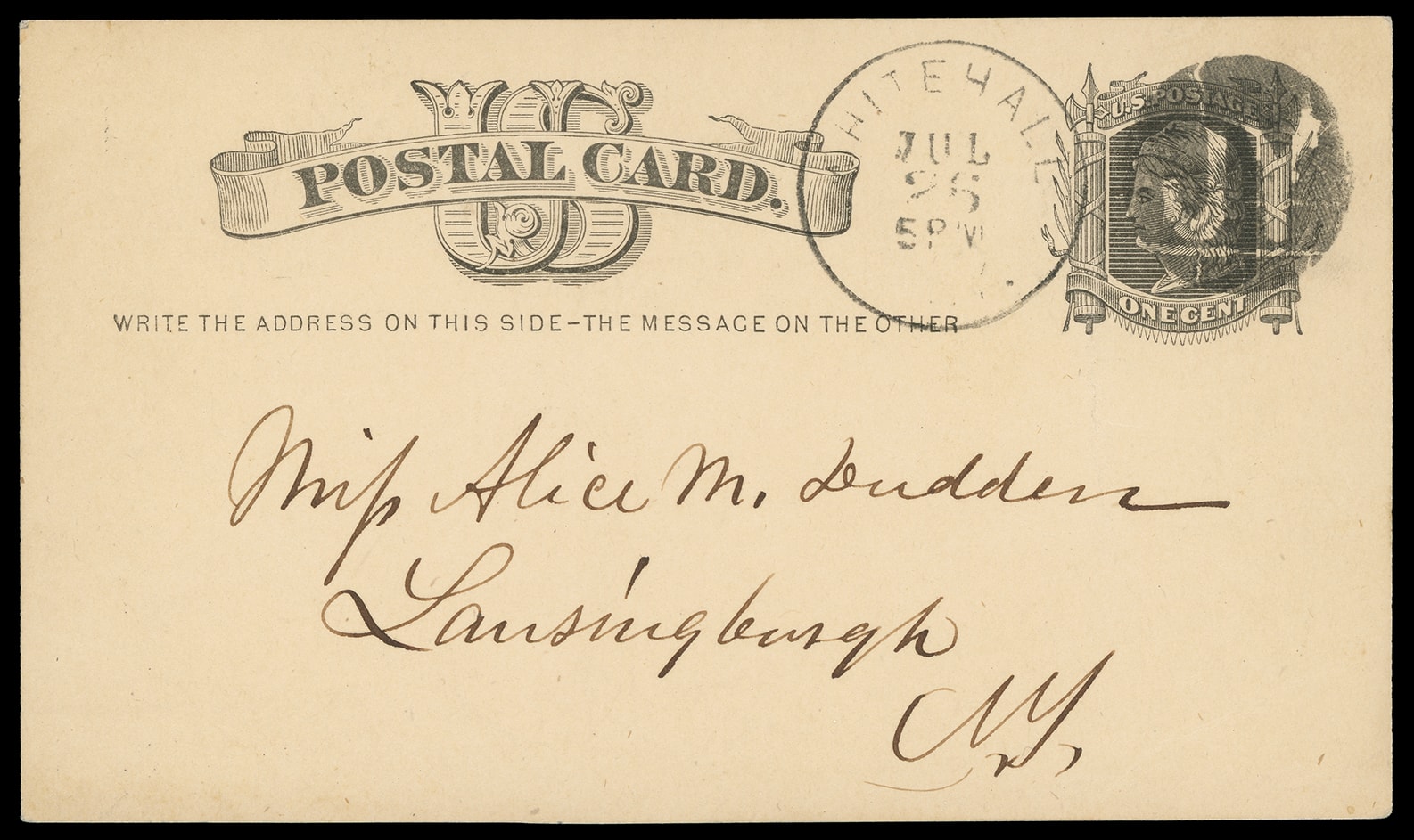 July. Bold strike duplexed with "Whitehall, N.Y. Jul 26" cds cnacels 1¢ postal card (UX5) to Lansingburgh N.Y., 1878 message, Very Fine and choice month fancy cancel strike. Cole No. ML-205; Estimate $100 - 150. (Image1) (Image2)