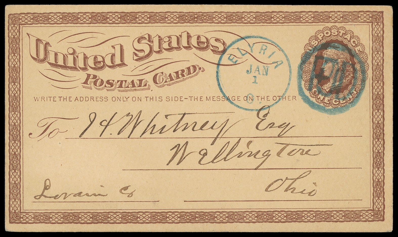 Circle. Bold blue strike duplexed with "Elyria O. Jan 1" cds on 1¢ postal card (UX3) to Bedford, Ohio, 1874 message, Extremely Fine and choice. Cole No. PO-15; Estimate $150 - 200. (Image1) (Image2)