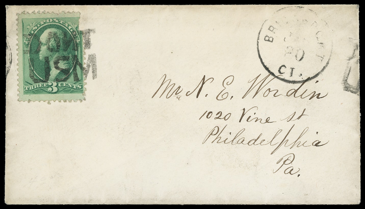 Bridgeport Ct. Bold complete strike ties 3¢ green (147), matching partial "Bridgeport Ct. Jan 20" cds on cover to Philadelphia Pa.; 3¢ nicked top right, a Very Fine strike. Cole No. ML-21; Estimate $100 - 150.