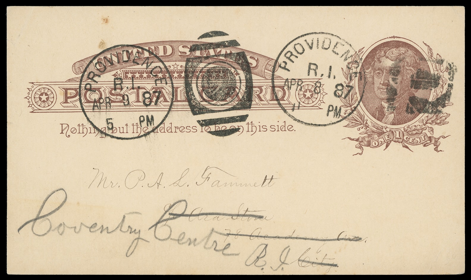 Providence R.I. Duplexed with time-on-bottom "Providence R.I. Apr 8 87, 11 PM" cds on 1¢ postal card (UX8) to local city street address, forwarded to Coventry Centre R.I. with bold barred oval duplexed with t.o.b. "Providence R.I., Apr 9