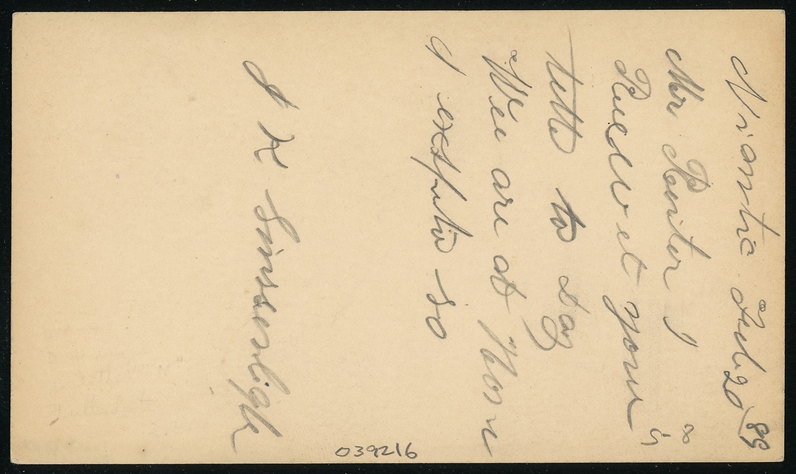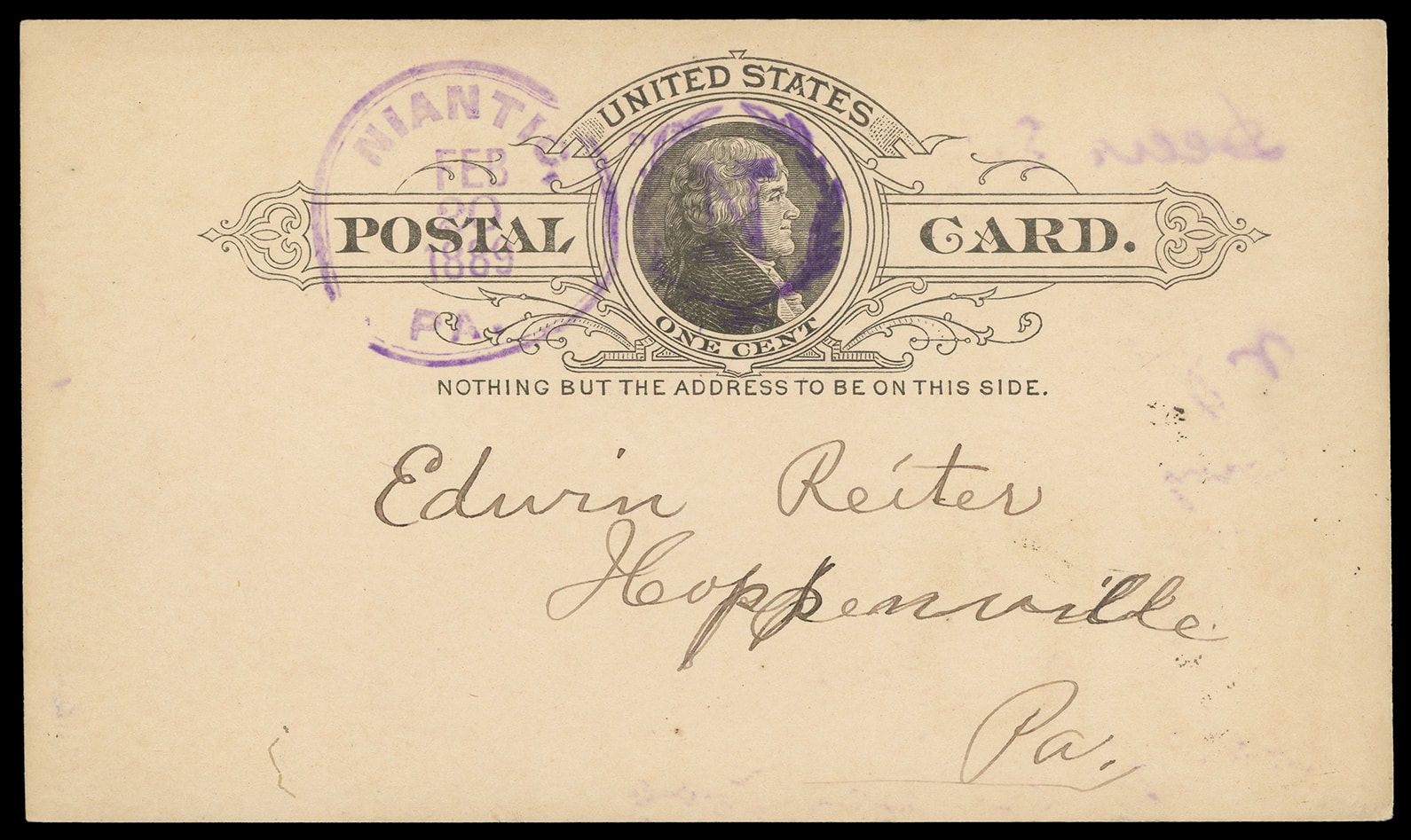 Purple strike duplexed with "Niantic Pa. Feb 20, 1889" cds cancels 1¢ postal card (UX9) to Hoppenville Pa., Very Fine and scarce. Cole No. L-10; Estimate $50 - 75.