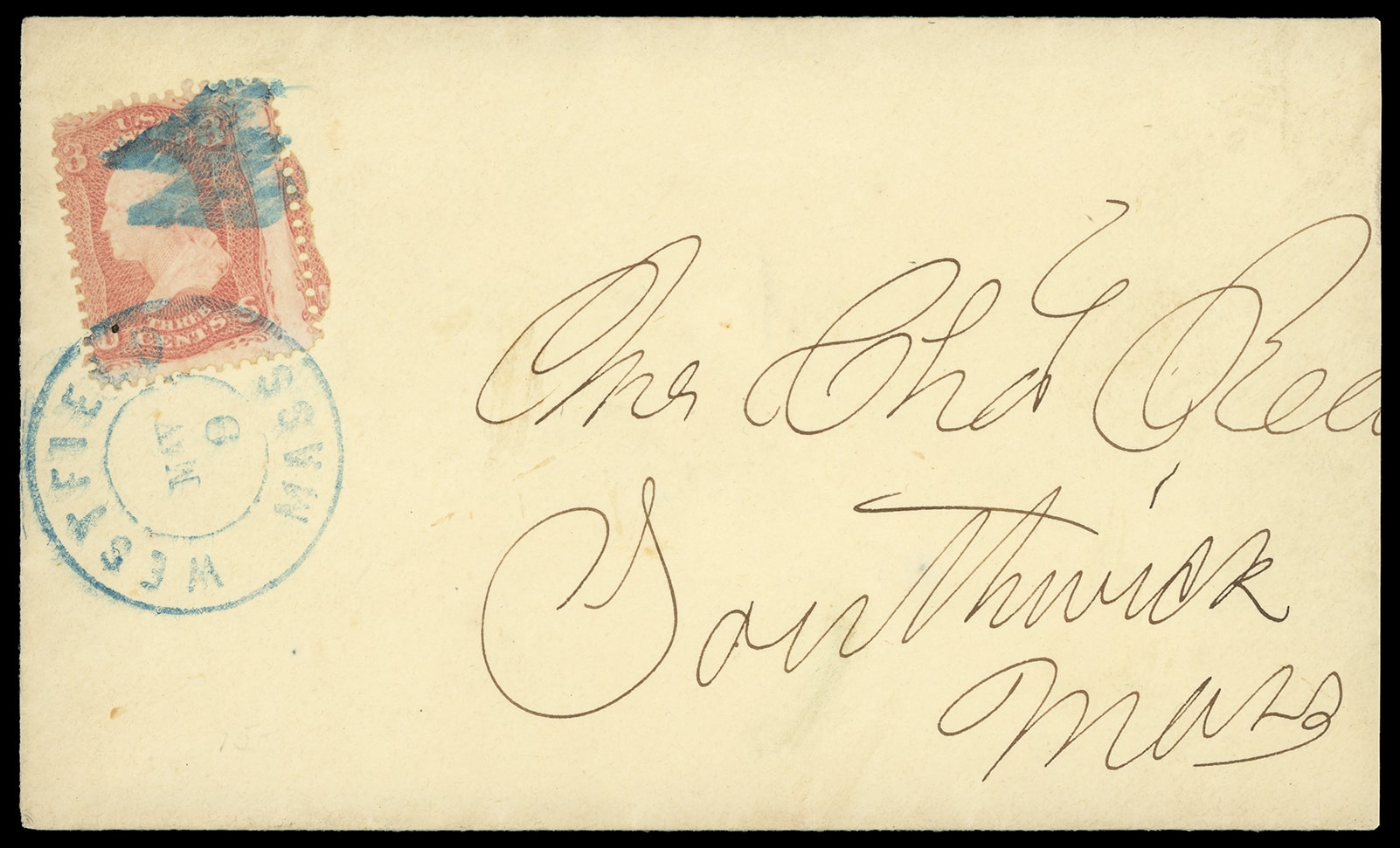 Mass. Bold blue strike duplexed with "Westfield Mass. May 9" double-circle datestamp ties 3¢ rose (65) on light buff cover to Southwick Mass.; reduced at right, otherwise Very Fine and choice strike of this unlisted fancy