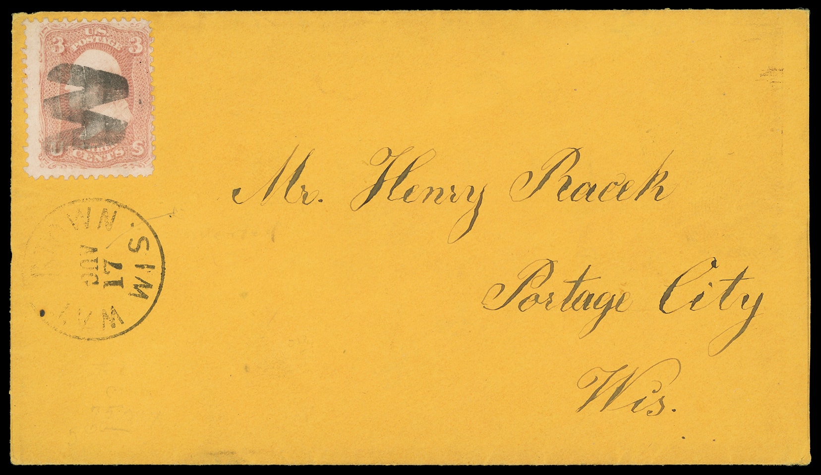 Wisc. Bold strike duplexed with partial "Watertown Wis. Aug 17" cds cancels 3¢ rose (65) on orange cover to Portage City Wisc., Very Fine. Skinner-Eno No. LS-W unlisted; Estimate $75 - 100. (Image1)