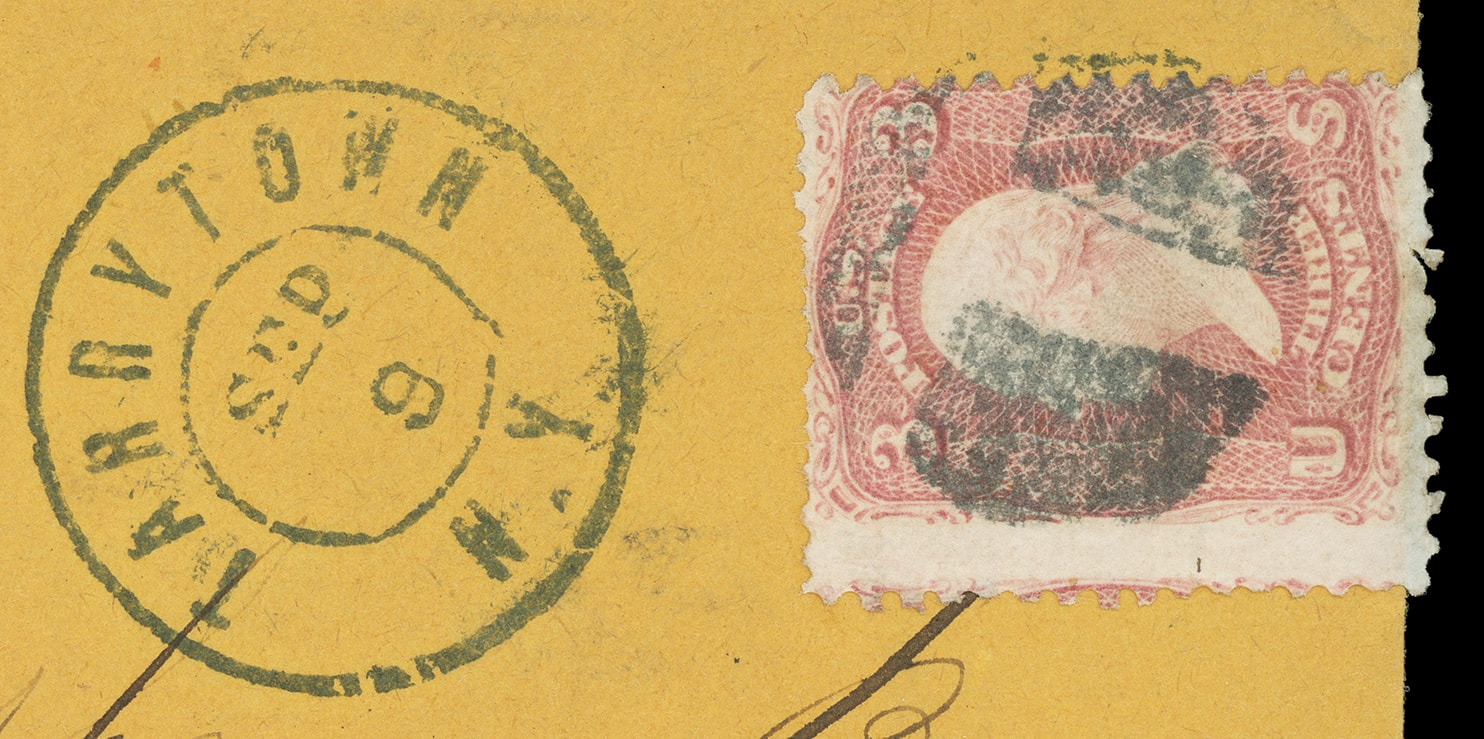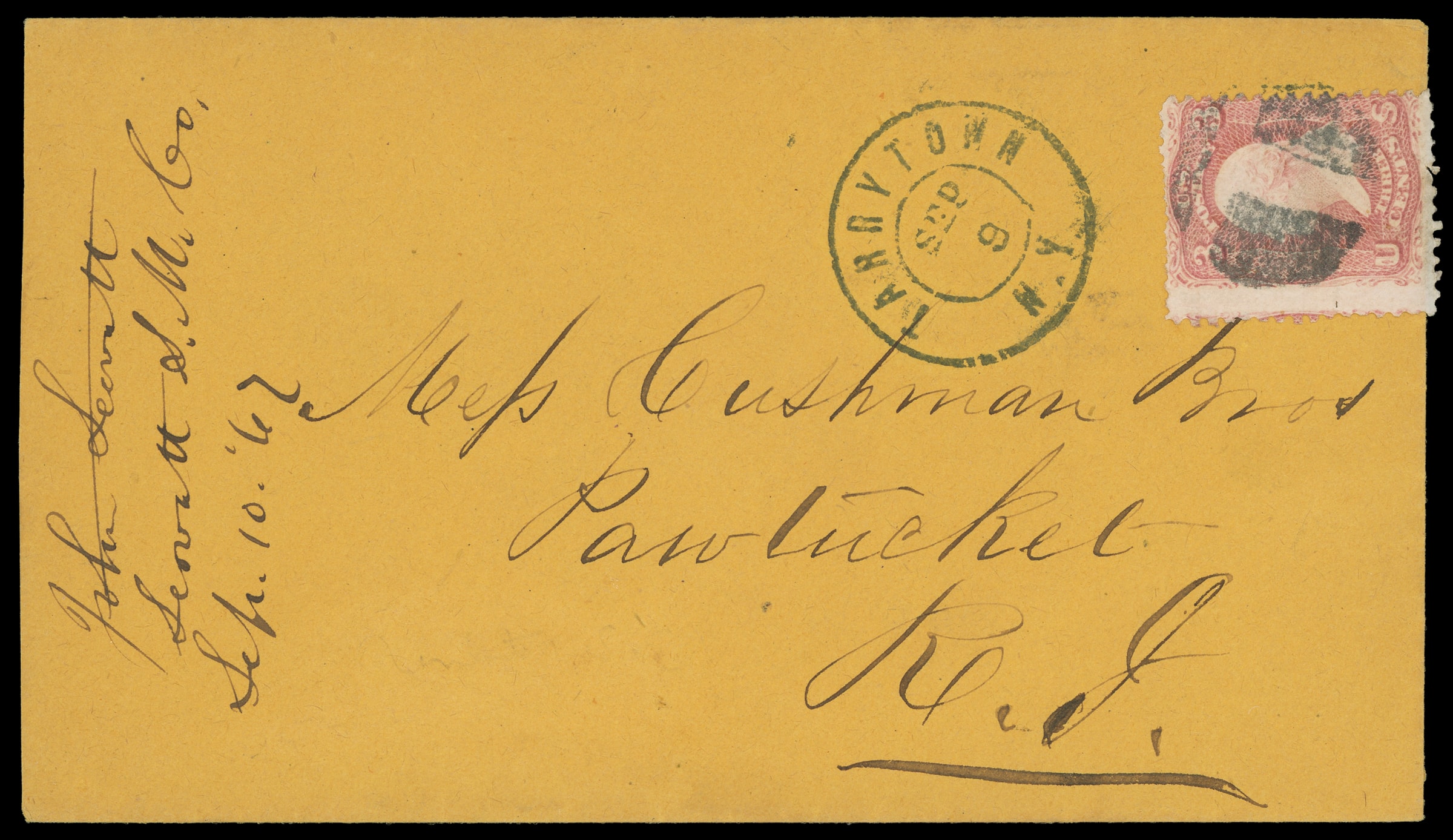 Tarrytown N.Y. Bold strike duplexed with sharp "Tarytown N.Y. Sep 9" cds ties 3¢ rose (65) on orange cover to Pawtucket R.I., 1867 docketing at left, 3¢ small flaws, Very Fine strike. Skinner-Eno No. LS-T