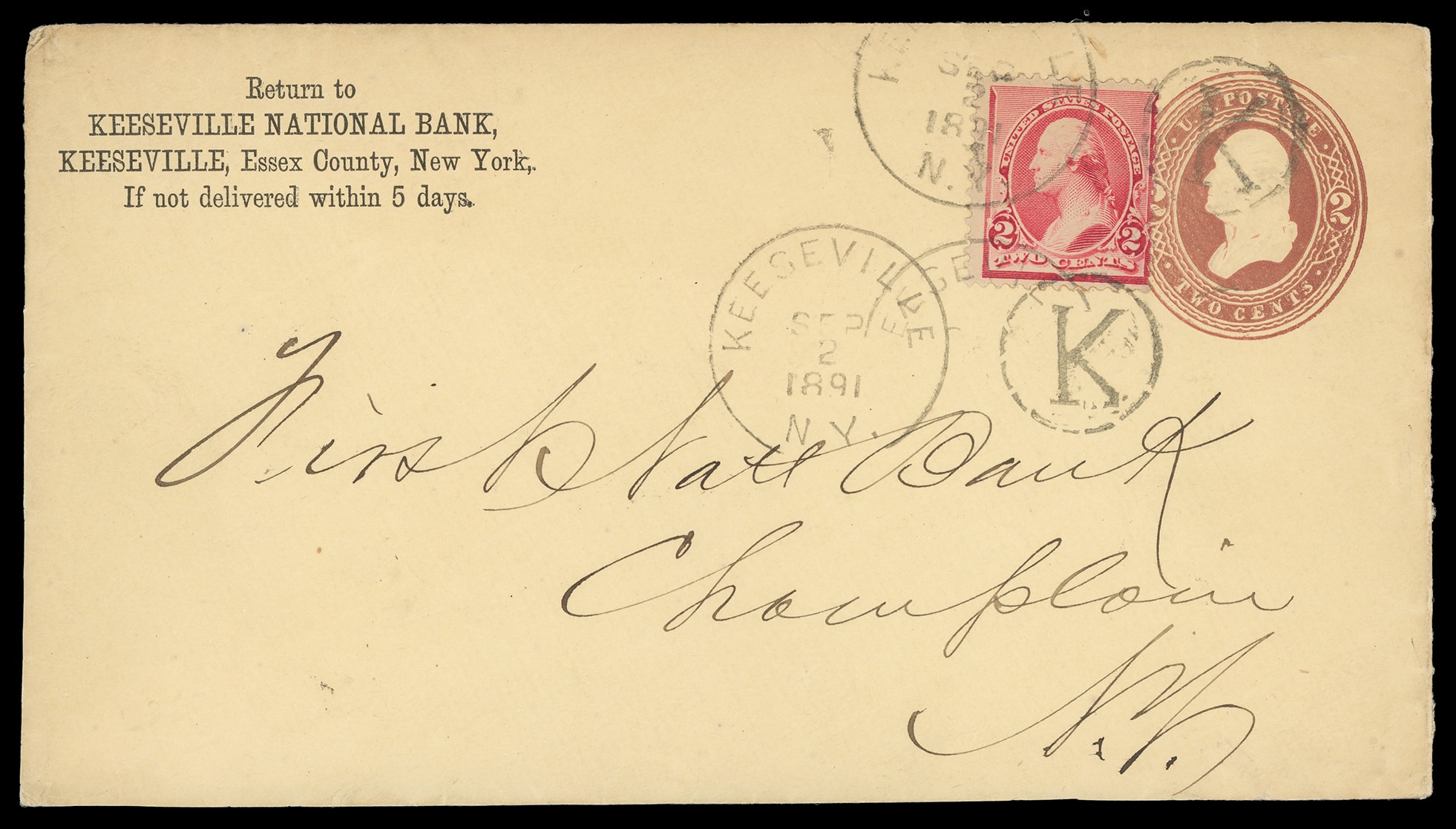 Keeseville N.Y. Bold duplex strikes tie 2¢ carmine (220) on 2¢ red brown entire to Champlain N.Y., Sep. 3rd arrival backstamp, Very Fine. Estimate; $50 - 75. (Image1)