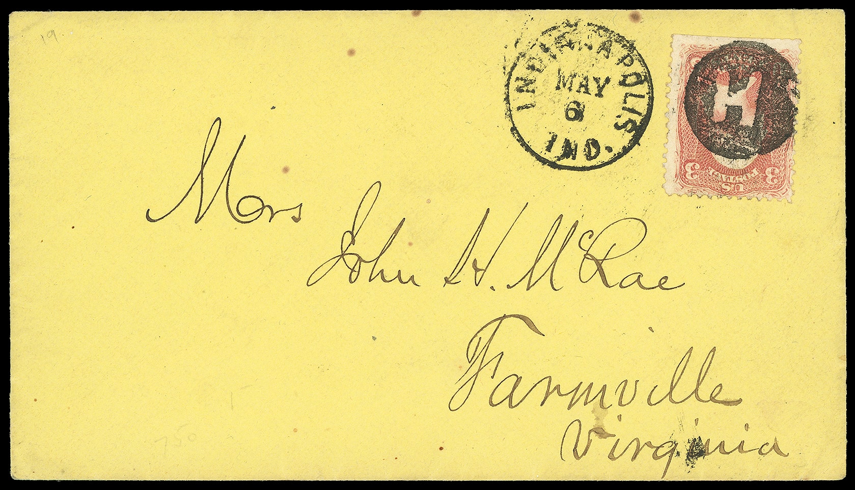 Circle. Bold strike duplexed with "Indianapolis Ind. May 6" cds cancels 3¢ rose (65) on yellow cover to Farmville Va., Very Fine and choice strike. Skinner-Eno No. LS-H unlisted; Estimate $75 - 100. (Image1)