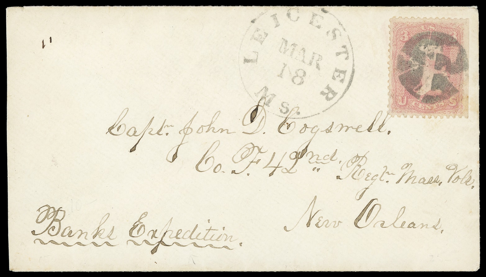 Bold strike cancels 3¢ rose (65), s.e. at right, matching "Leicester Ms. Mar 18" cds on cover with military address to Capt. John D. Cogswell, Co. F. 42nd Regt. Mass. Vols., New Orleans La., Banks Expedition; reduced slightly at left, Very