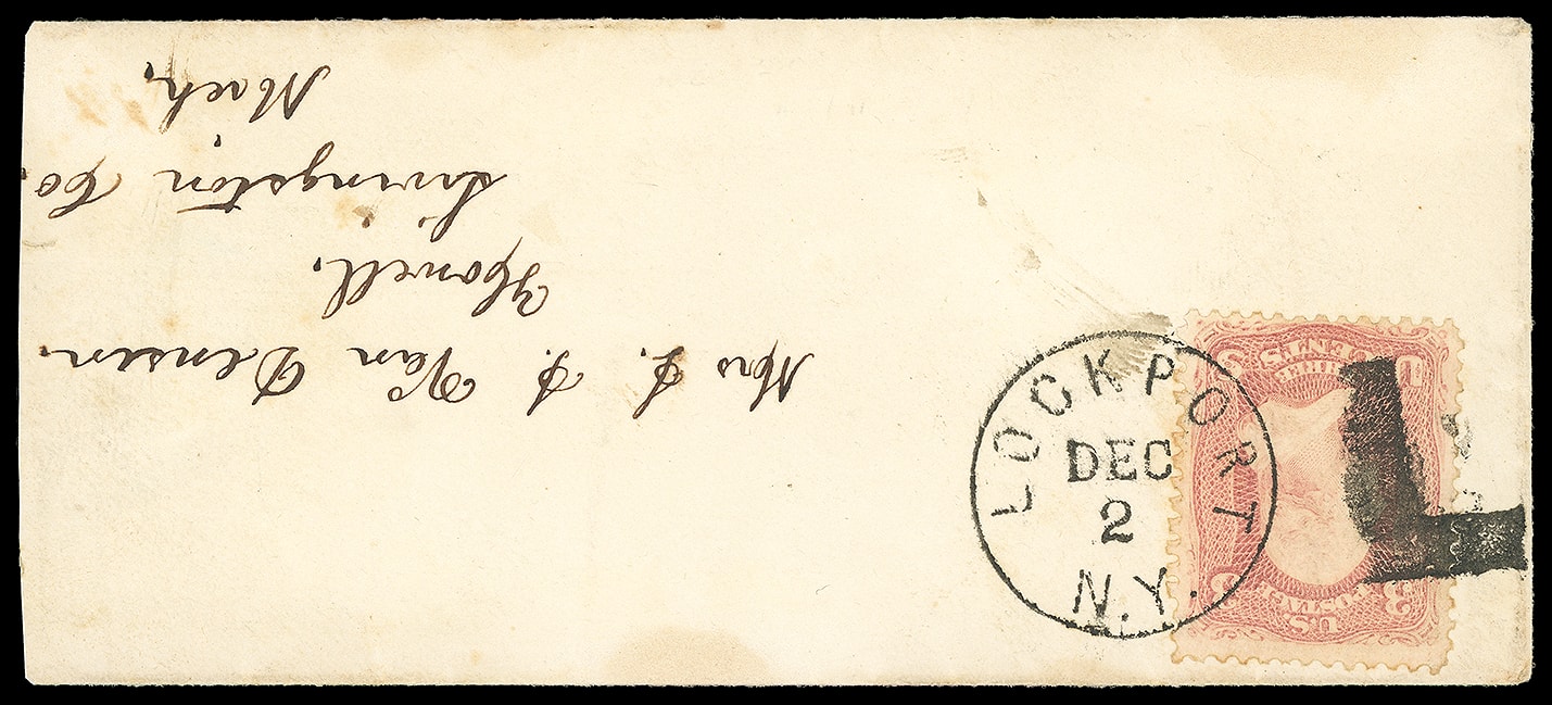 N.Y. Bold strike duplexed with "Lockport N.Y. Dec 2" cds ties 3¢ rose (65) on small cover to Howell, Michigan; reduced at right. Estimate; $75 - 100.