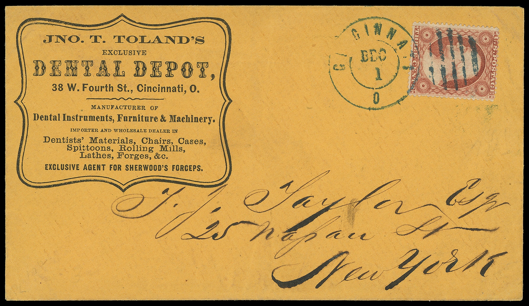 Toland's Dental Depot, Cincinnati Oh. Fancy shield corner card on orange cover bearing 3¢ dull red (26) tied by blue circular grid duplex with "Cincinnati O. Dec 1" cds to New York City, Very Fine and attractive. Estimate; $100 -