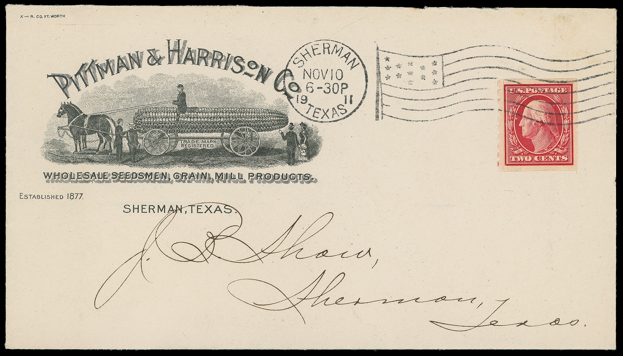 Seedsmen, Grain, Mill Products, Puttman & Harrison Co., Sherman, Texas. Illustrated ad showing horse-drawn corn carriage, overal text ad on reverse of cover bearing 2¢ carmine coil tied by "Sherman, Texas Nov 10, 1911" flag machine
