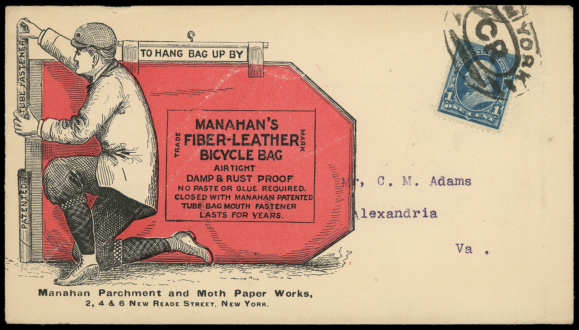 Fiber-Leather Bicycle Bag, New York N.Y. Bicolor illustrated ad showing leather bicycle bag on amber cover bearing 1¢ dark blue (264), well centered with rich color, tied by bold "New York, CR" oval to Alexandria Va., Very Fine