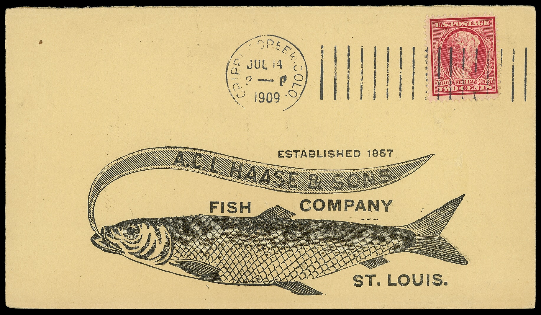 A.C.L. Haase & Sons, Fish Company, St. Louis, Mo. Illustrated return envelope showing fish on buff cover bearing 2¢ Lincoln (367) tied by "Cripple Creek, Colo. Jul 14, 1909" machine cancel to St. Louis Mo., Extremely