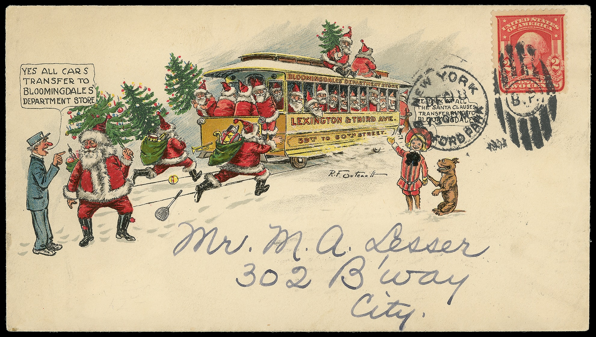 Bloomingdales' Department Store. Multicolored illustrated design showing Santa Clauses Catching Streetcar to Bloomingdales' and Buster Brown Cartoon by R.F. Outcault on cover bearing 2¢ shield (319) tied by "New York, Bedford