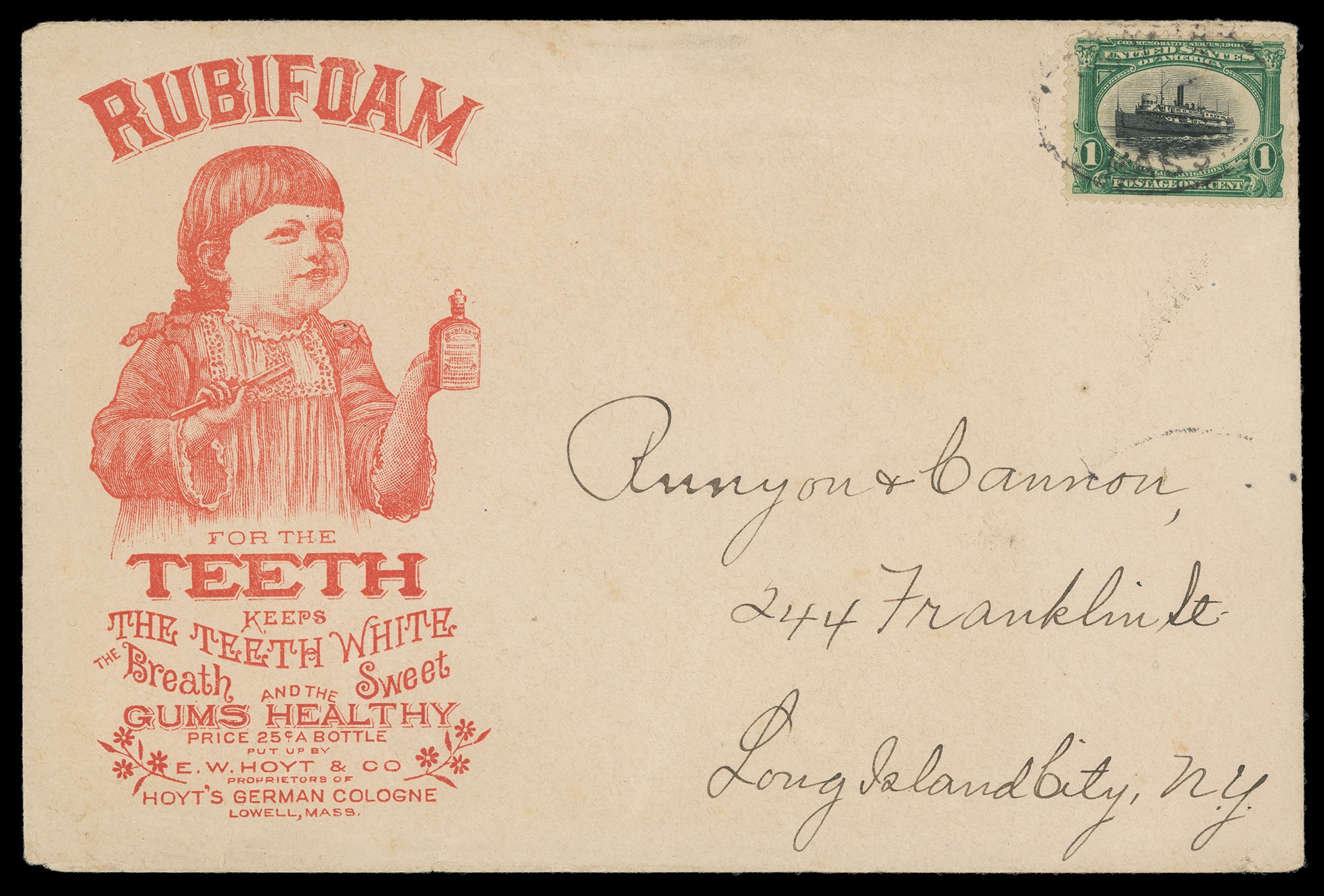 Keeps the Teeth White, E.W. Hoyt & Co., Lowell Mass. Red illustrated advertising featuring young girl with bottle on unsealed cover bearing 1¢ Pan-American (294) tied by "Lowell, Mass." oval to Long Island City N.Y., Very