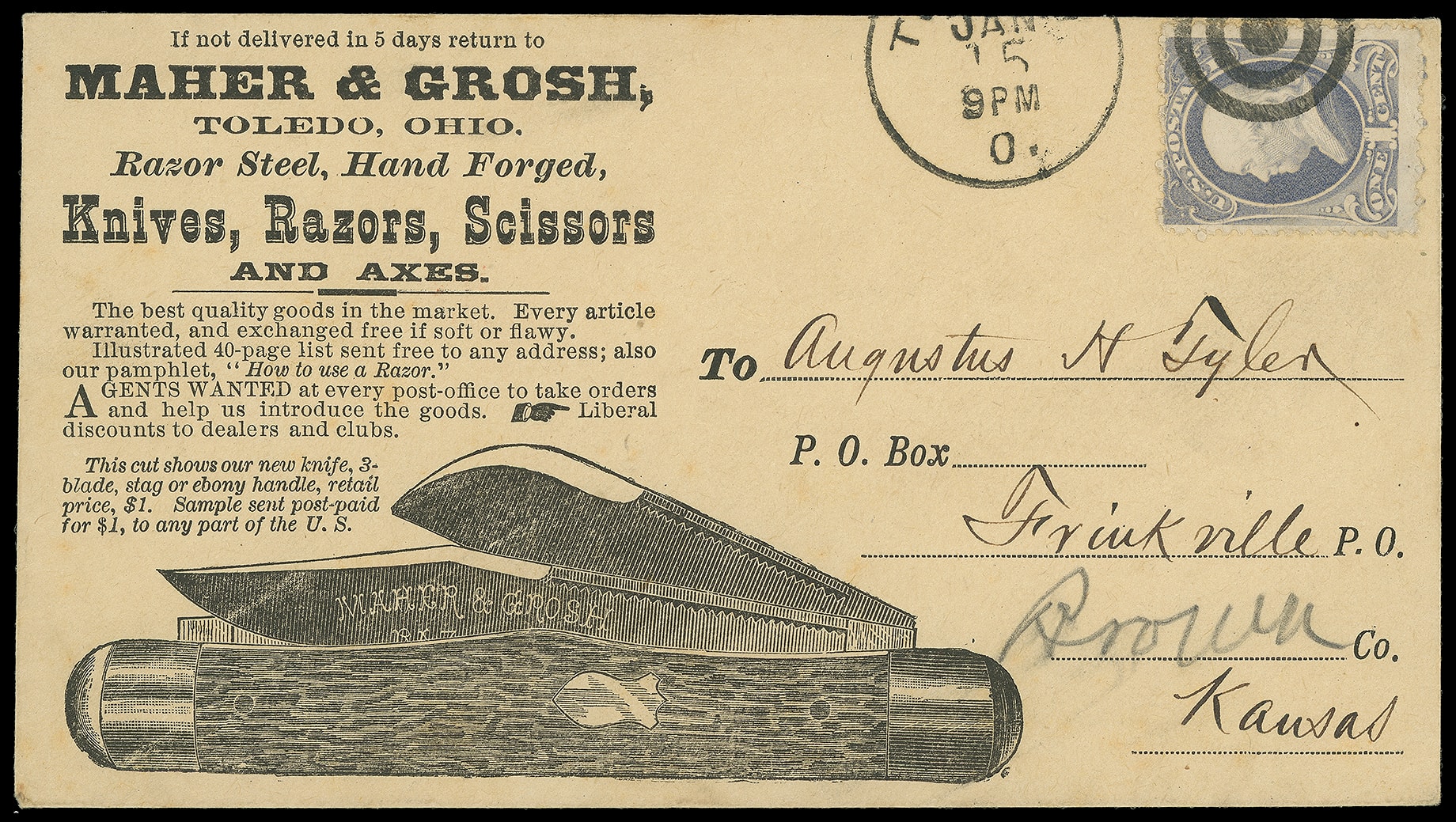 Razors, Scissors and Axes, Maher & Grosh, Toledo Oh. Illustrated ad design showing pocket knife on unsealed light buff cover bearing 1¢ grey blue (206) tied by target cancel duplexed with partial "Toledo O. Jan 15" cds to Friukville,