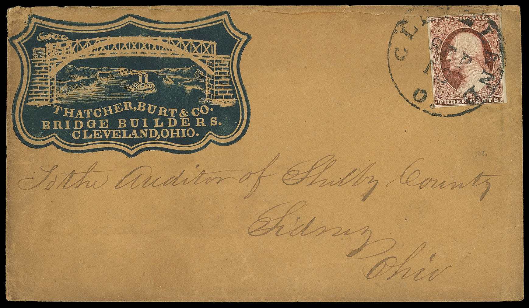 Burt & Co., Bridge Builders, Cleveland, Ohio. Blue illustrated shield cameo showing bridge with steamboat beneath on dark buff cover bearing 3¢ dull red (11A), large margins to barely touched, tied by "Cleveland O. Sep 13" cds to Sidney,