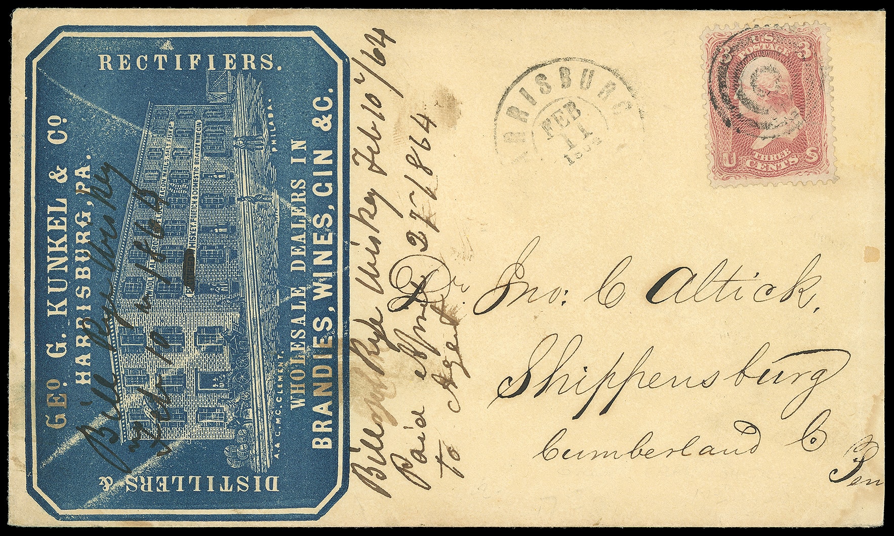 Kunkel & Co., Distillers & Rectifiers, Harrisburg Pa. Blue illustrated building cameo on light buff cover bearing 3¢ rose (65) just tied by four-ring cancel, matching partial "Harrisburg Pa., Feb 11, 1864" cds to Shippensburg Pa.,