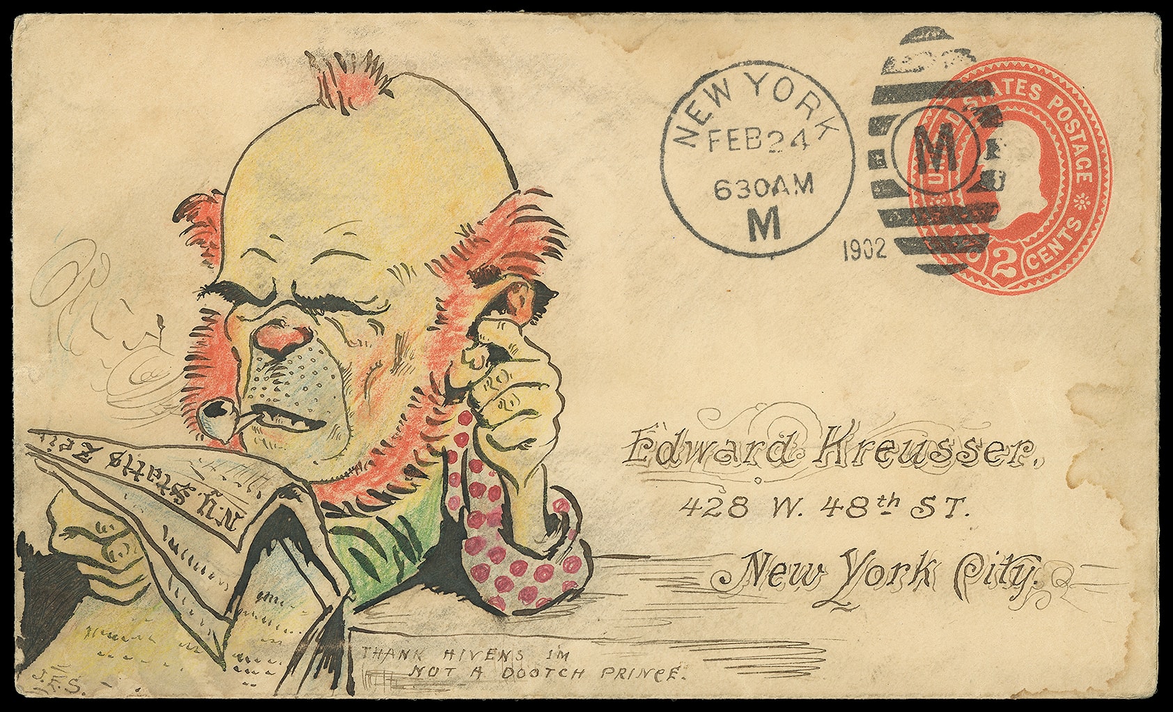 Bald Man reading Newspaper. Multicolor design with "Thank Hivens I'm Not a Dootch Prince" slogan on 2¢ carmine entire canceled by bold "New York 'M' Feb 24, 1902" duplex with fancy address to New York City street address; light soiling and