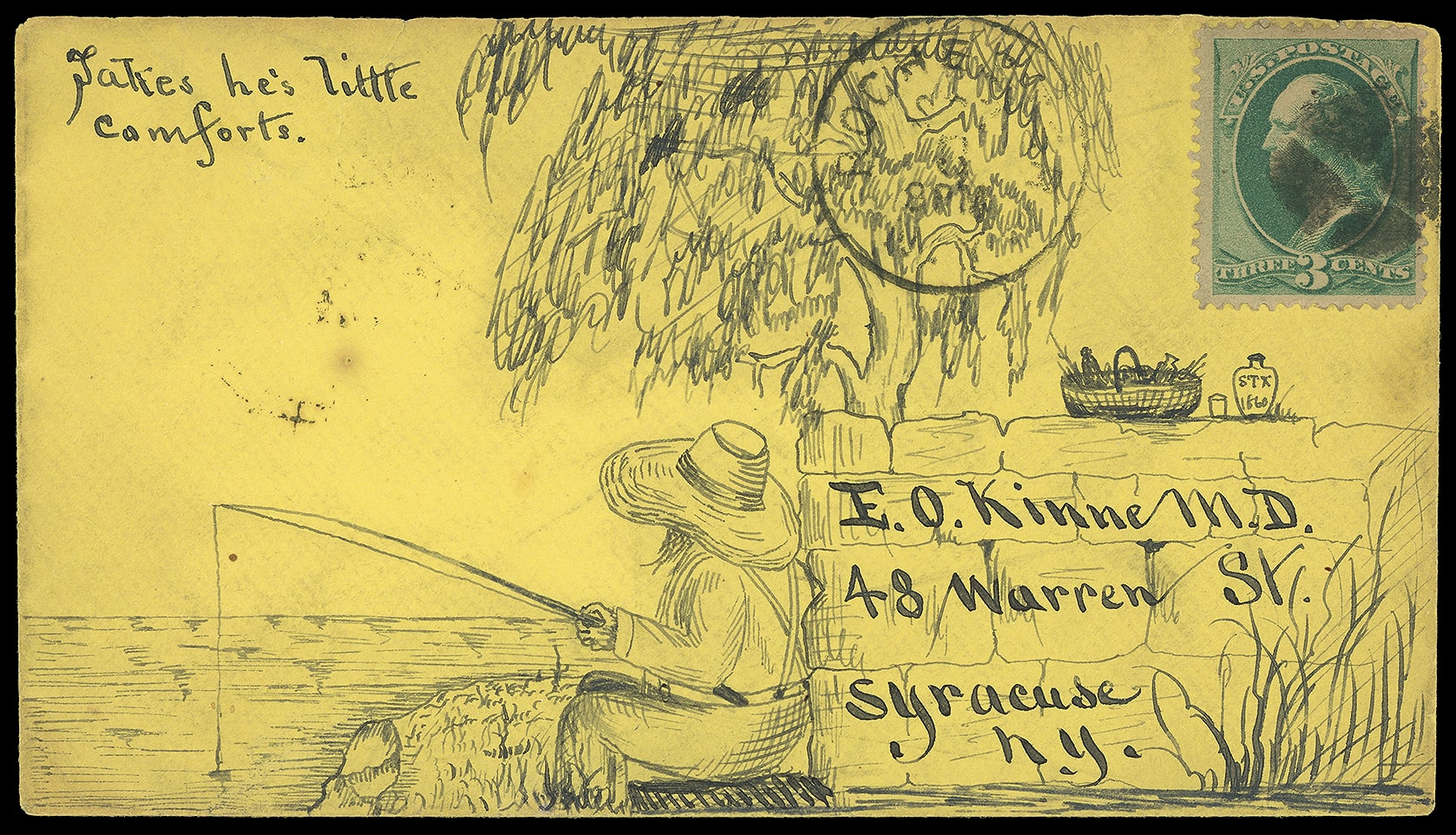 Man Fishing "Takes he's little comforts". Overall design on yellow cover bearing 3¢ green (207) tied by quartered cork duplexed with "Rochester N.Y. Sep 3" cds to Syracuse N.Y.; cover tear, flap missing, otherwise Very Fine and fantastic