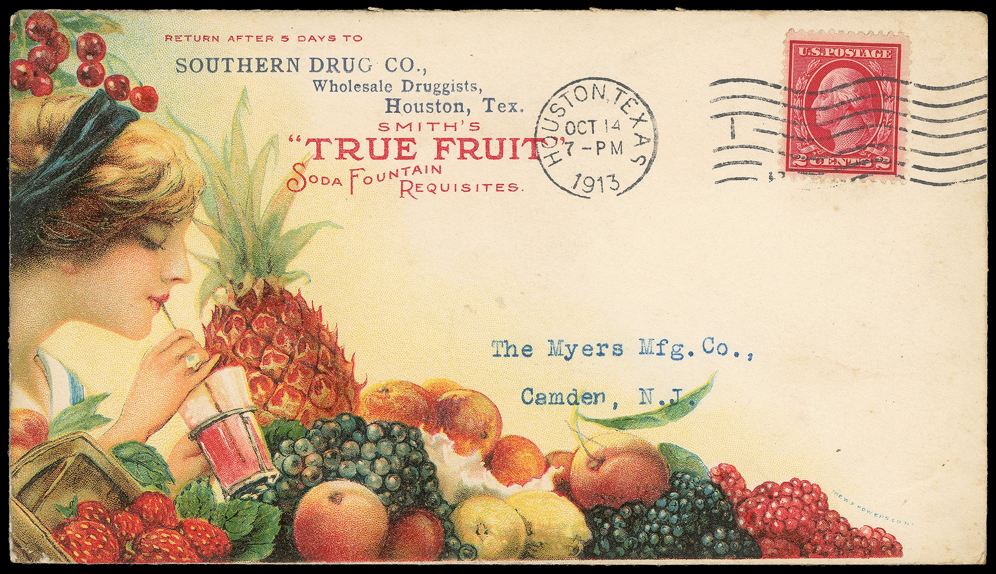 Fruit" Soda Fountain Requisites, Detroit, Mich. Multicolored illustrated agent ad design showing Women Drinking Soda and Various Fruit on Southern Drug Co. corner card cover bearing 2¢ red tied by "Houston, Texas Oct 14, 1913"