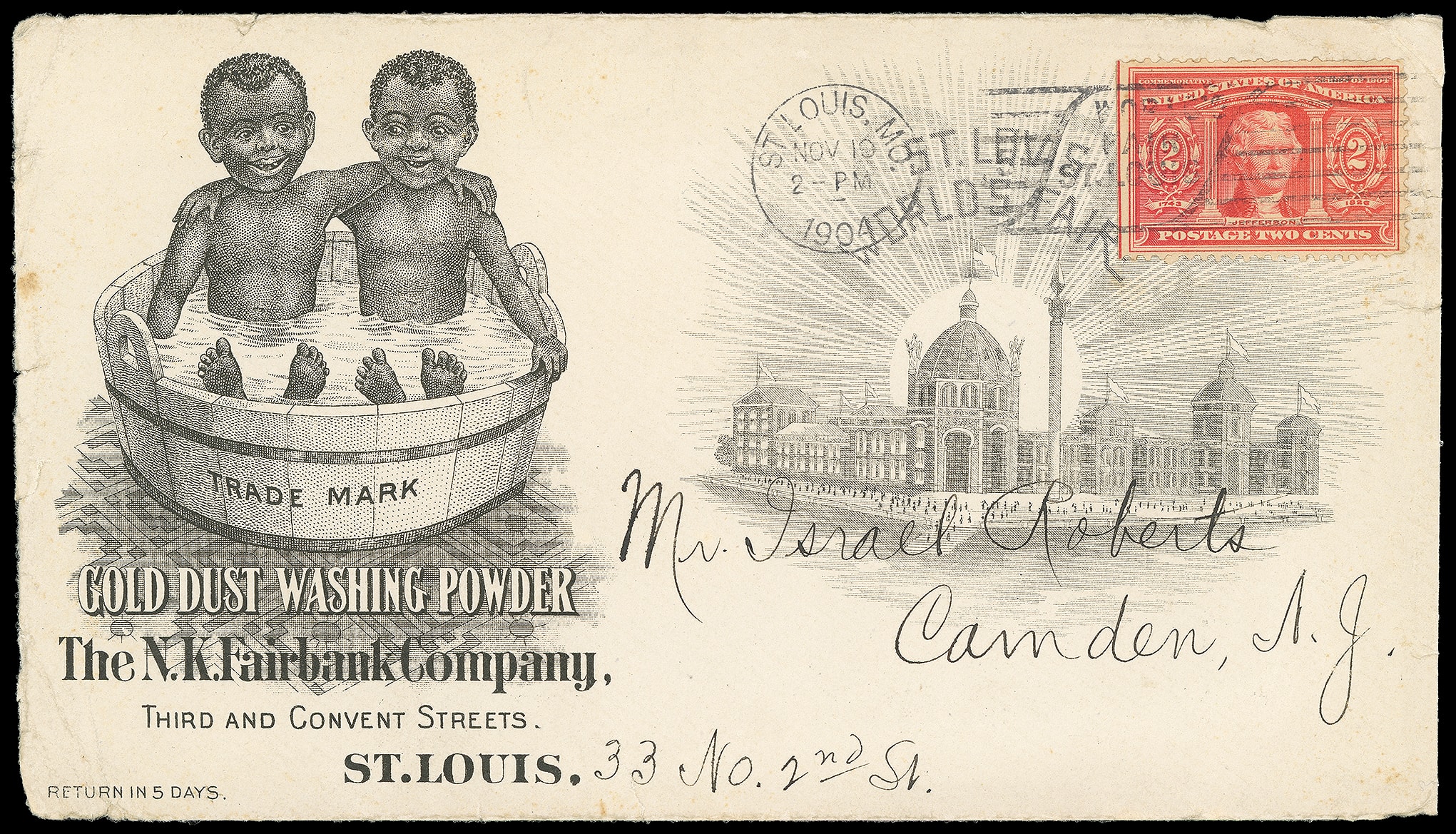 Washing Powder. Illustrated ad design showing Gold Dust Twins in Tub and additional 1904 St. Louis Fair Expo design on cover bearing 2¢ Louisiana Purchase (324) tied by "St. Louis, Mo. Nov 19, 1904" expo machine cancel to