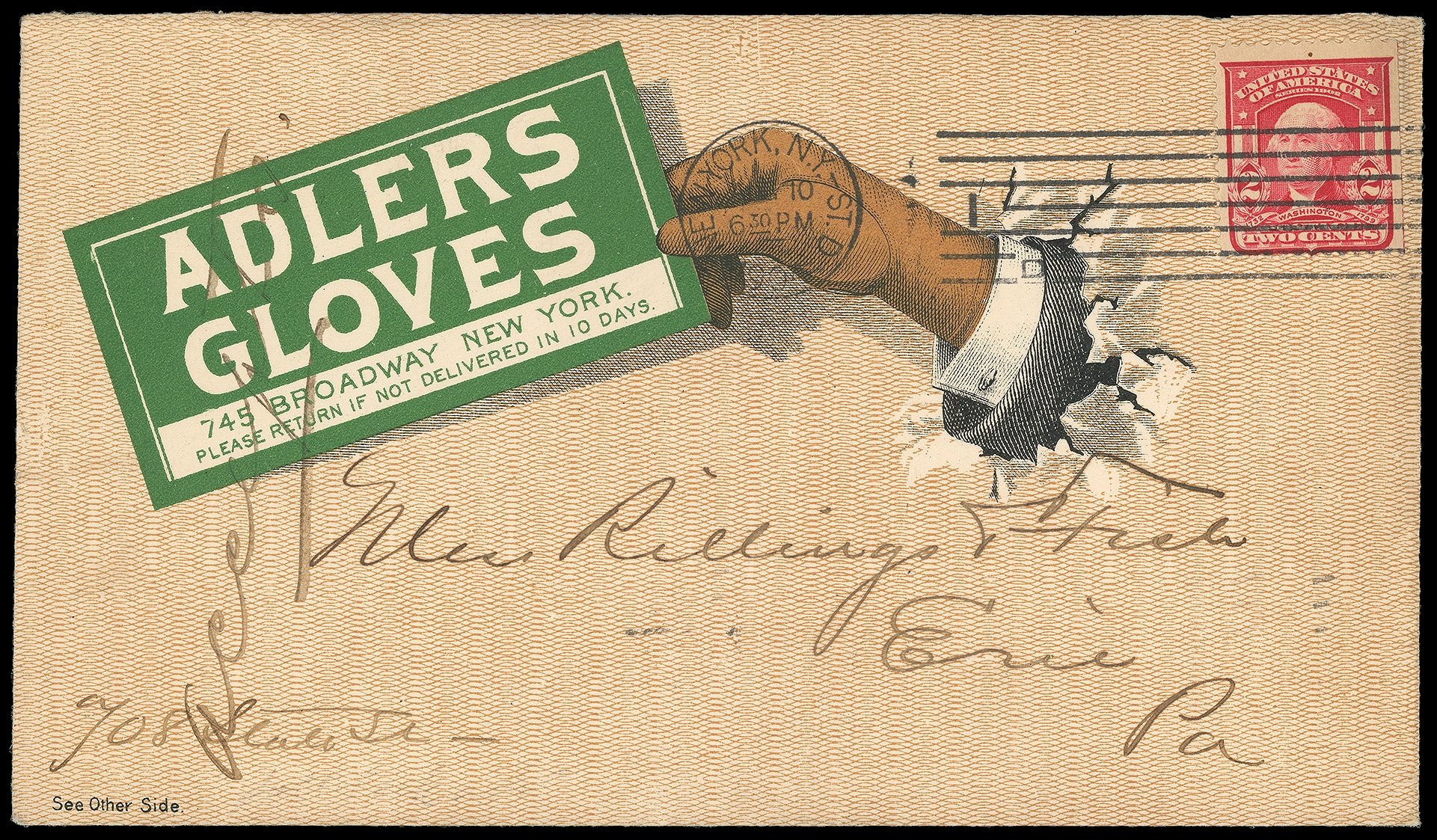 Gloves, New York City. Multicolor overall ad on front and back showing hand holding card on cover bearing 2¢ shield (319) tied by "New York, N.Y. - St. D, May 10, 1904" machine cancel to Erie Pa., docketed "accounts", Very Fine and