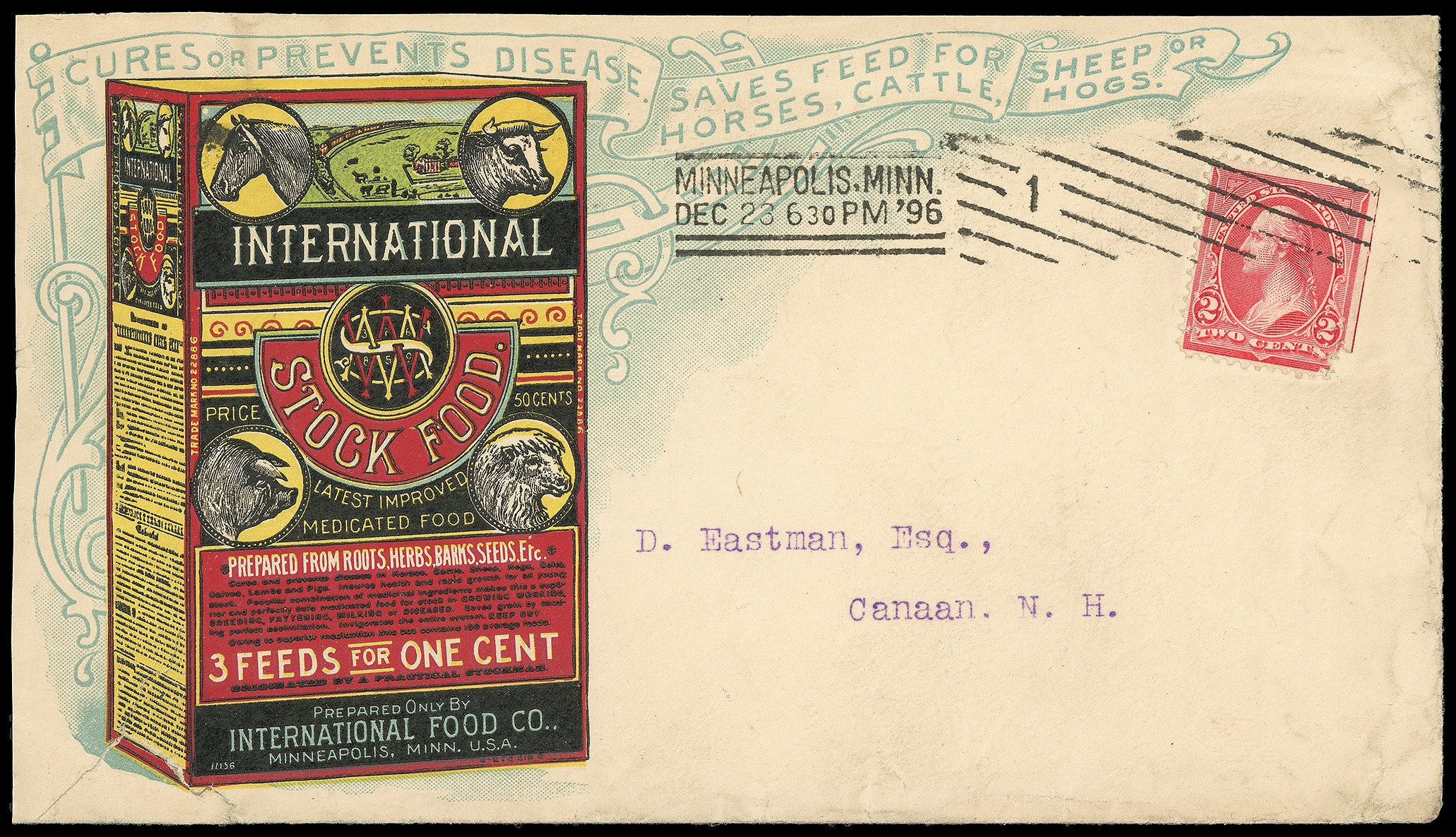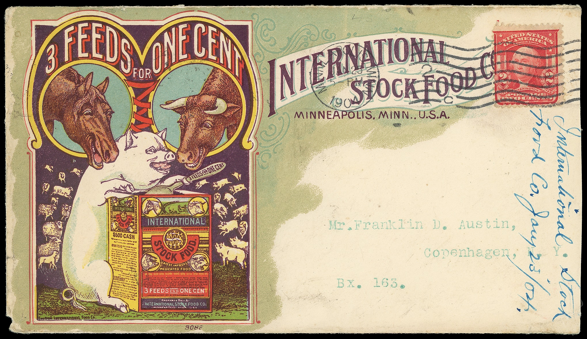 International Stock Food Co., Minneapolis Minn. Multicolored illustrated ad cover bearing 2¢ shield (319) tied by "Minneapolis, Minn. Jan 25, 1904" machine cancel to Copehagen N.Y., docketing at right; reduced slightly at right and corner