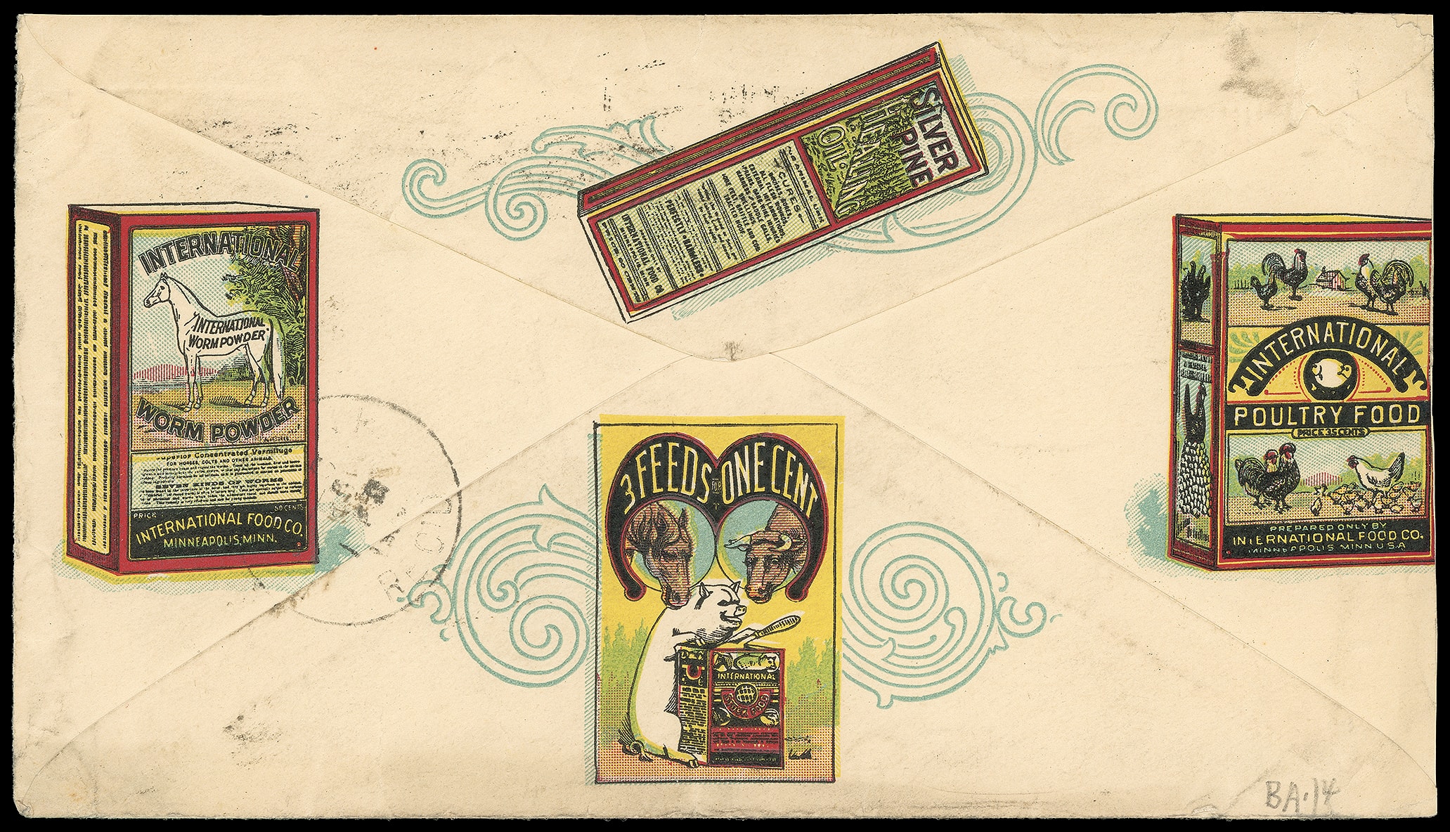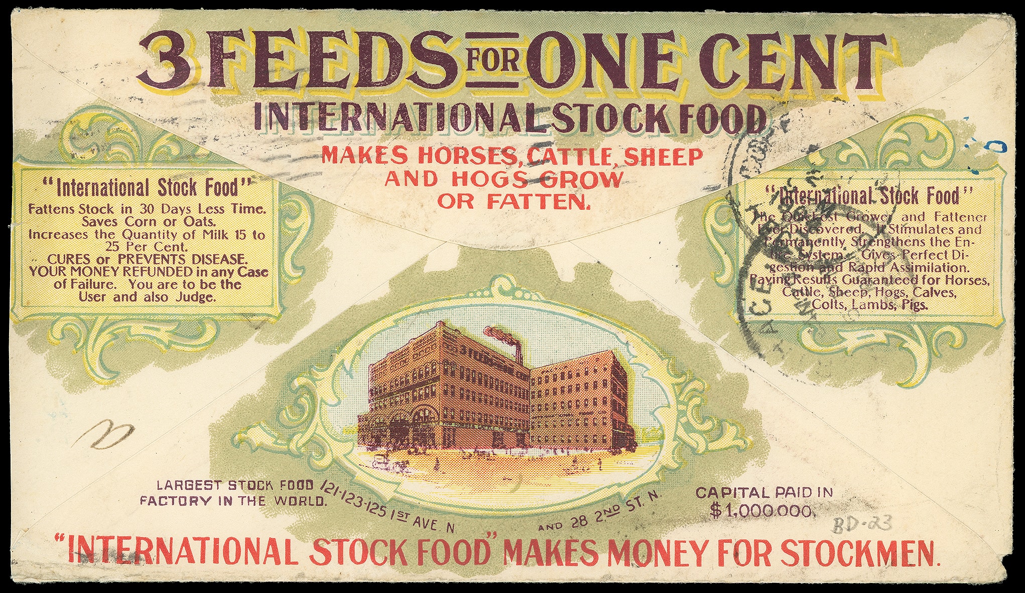 International Stock Food Co., 3 Feeds For One Cent, Minneapolis, Minn. Multicolored illustrated design showing feed box with animal vignettes, additional ad text and feed boxes on reverse on cover bearing 2¢ carmine (279B), corner flaw,