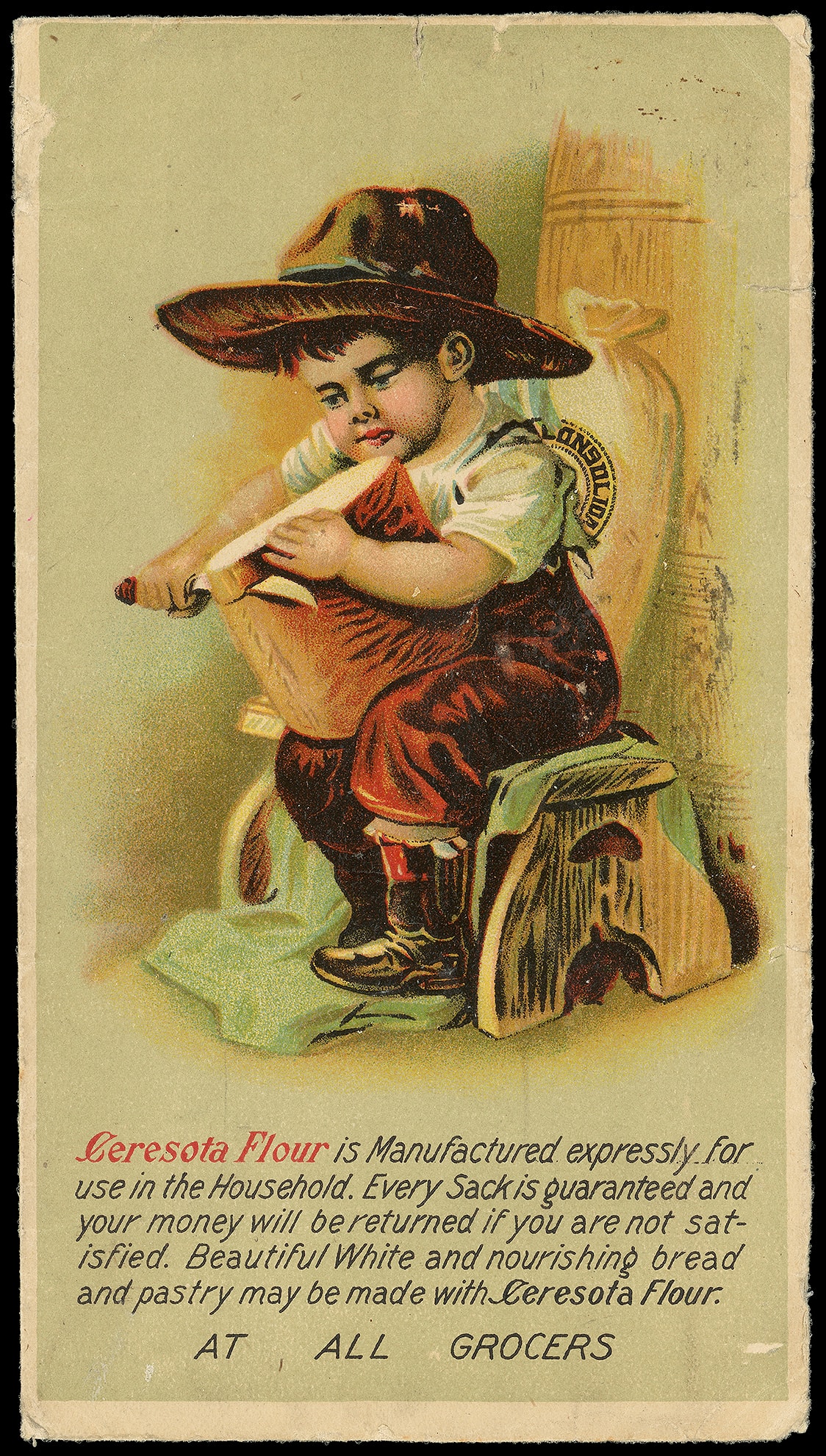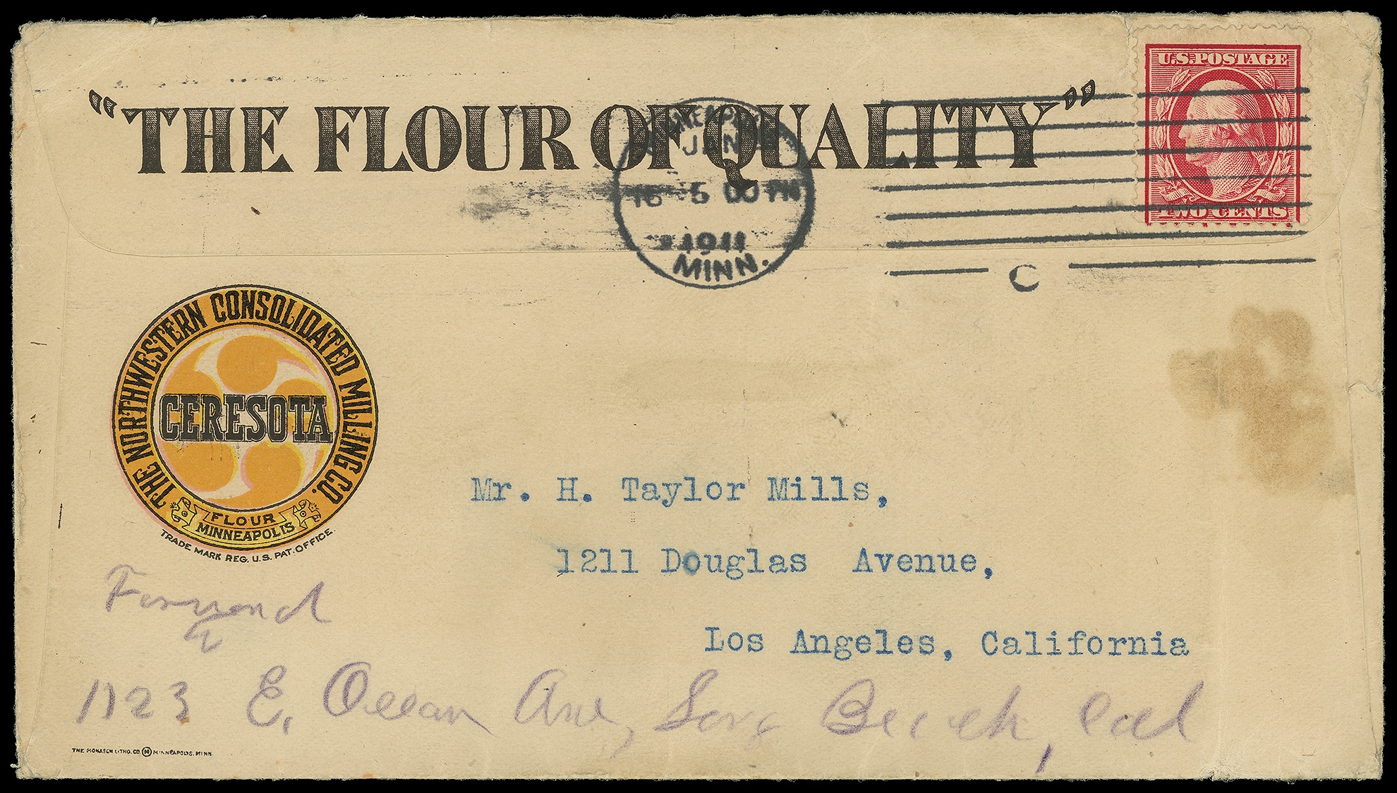 Ceresota Flour, The Northwestern Consolidated Milling Co., Minneapolis Minn. Multicolor overall ad design showing boy carving bread on cover bearing on reverse 2¢ carmine tied by "Minneapolis Minn. Jun 16, 1911" machine cancel to Los