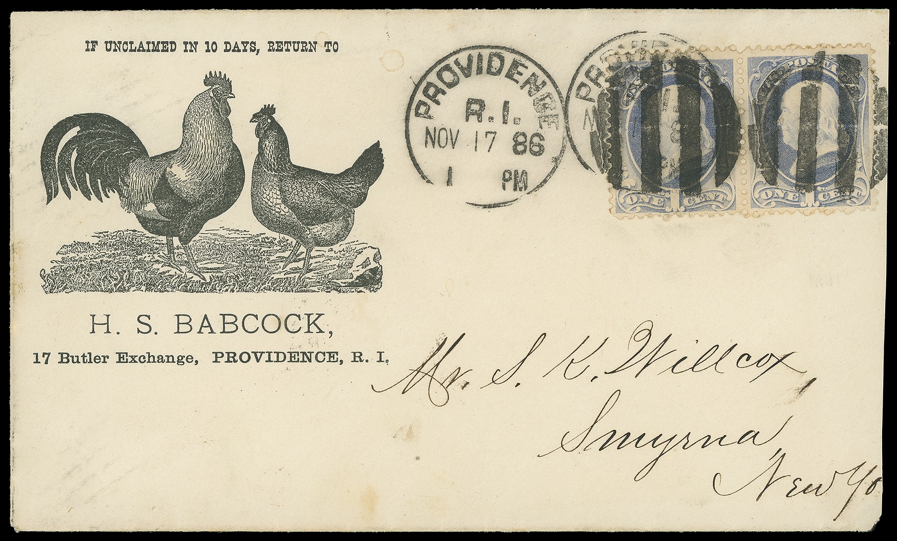 H.S. Babcock, Providence R.I. Illustrated corner card showing two chickens on cover bearing 1¢ blue gray (206) pair tied by bold four-grid duplexed with "Providence R.I., Nov 17 '86" duplex to Smyrna N.Y.; reduced at right,