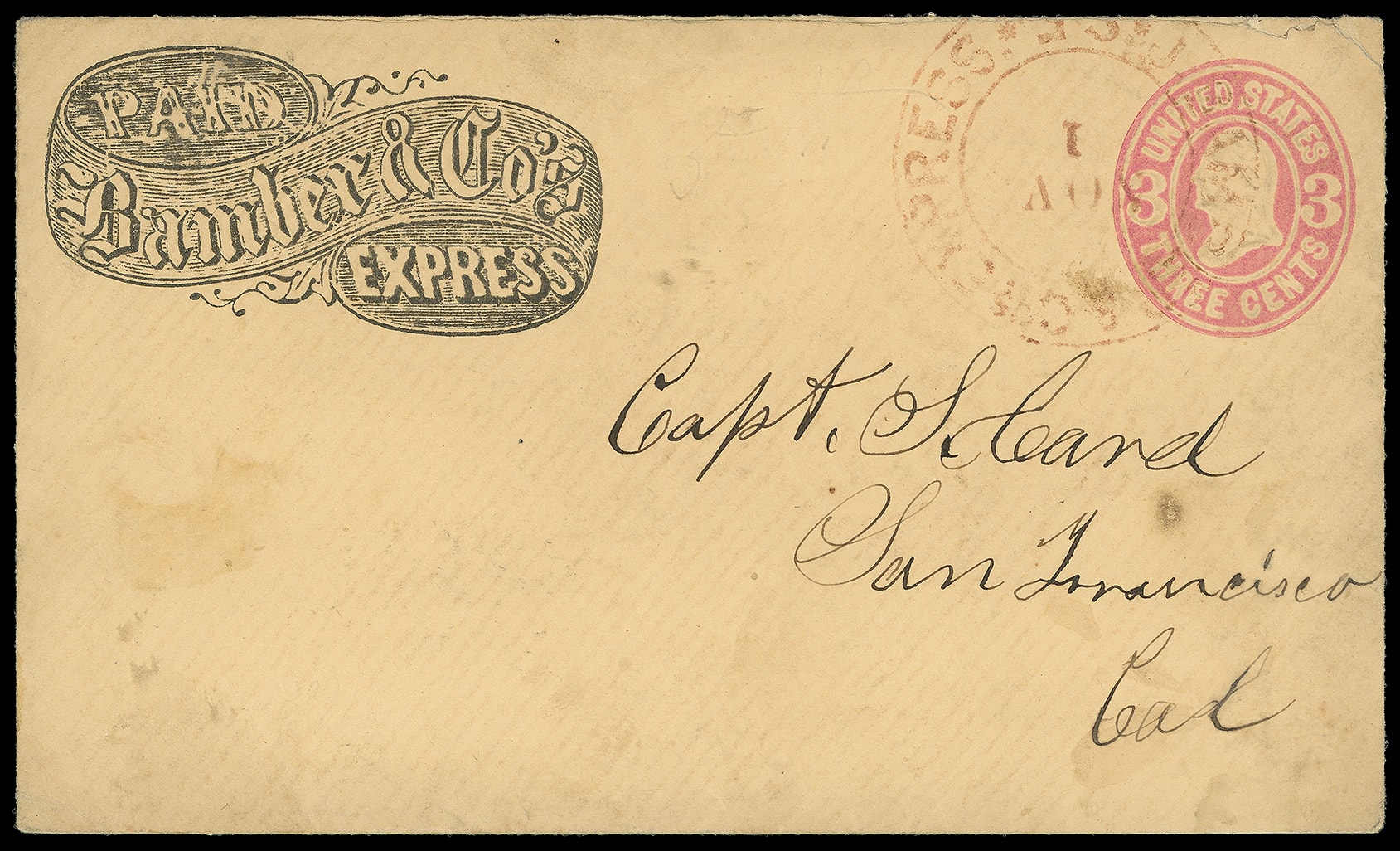 Express, S.F., Nov 1. Red double-circle datestamp cancels 3¢ pink (U59) buff entire with printed "Bamber & Co's Express" frank to San Francisco Cal.; couple tone spots, F.-V.F. Estimate; $100 - 150. (Image1)