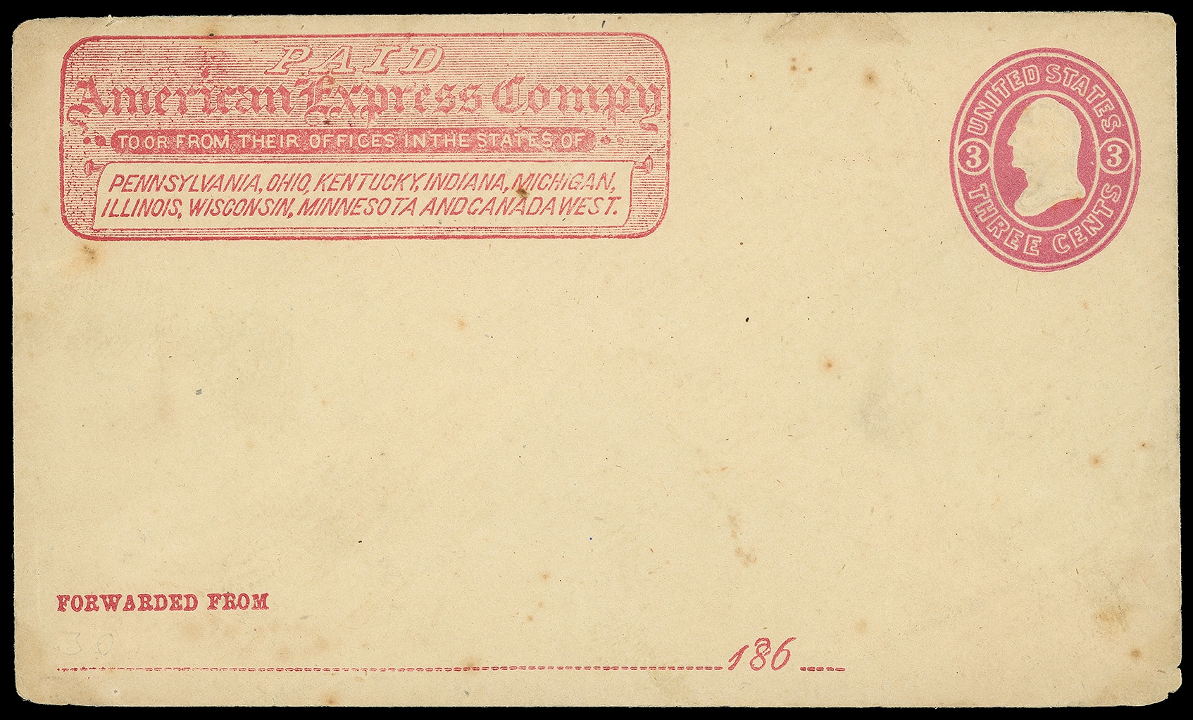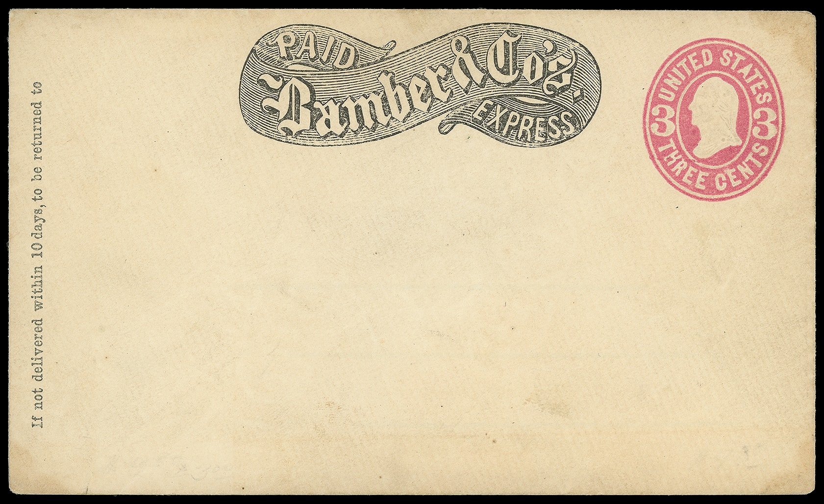Express. Printed ribbon frank on 3¢ pink (U58) mint entire, F.-V.F. Estimate; $30 - 40. (Image1)