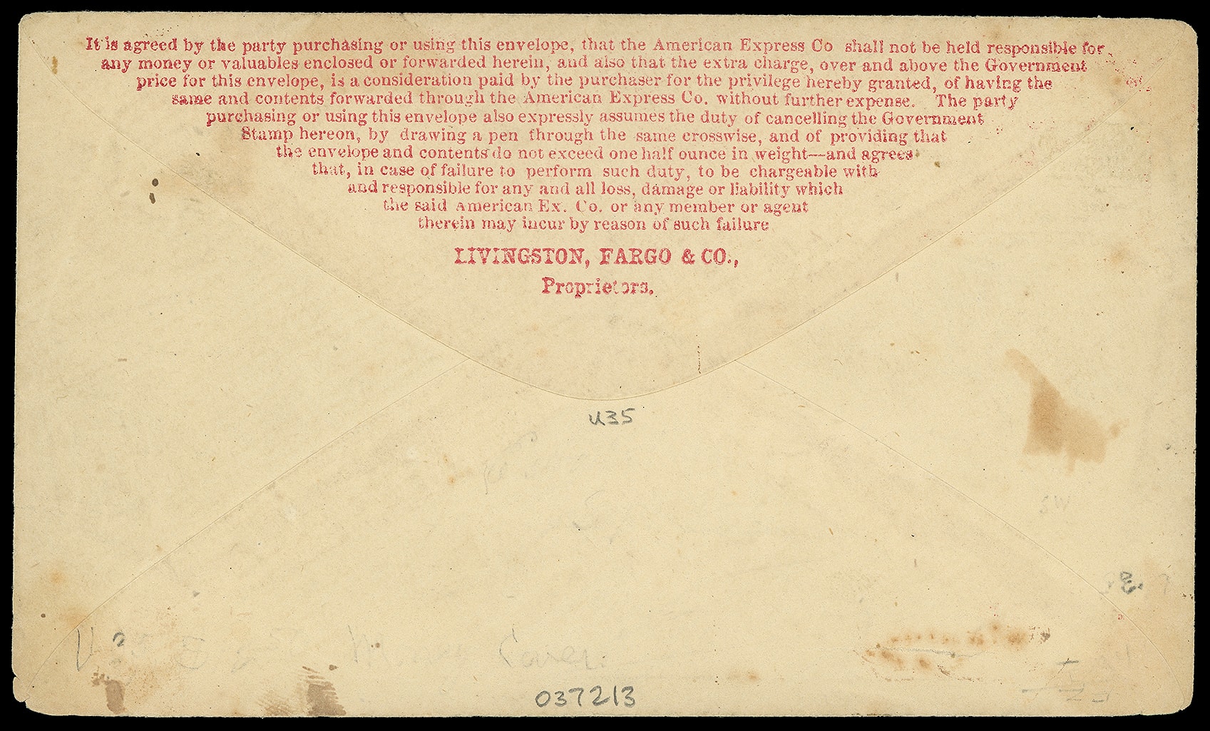Company. Red printed frank on 3¢ pink (U34) entire, flap with printed warranty of service by Livingston, Fargo & Co.; wear, F.-V.F. Estimate; $50 - 75.