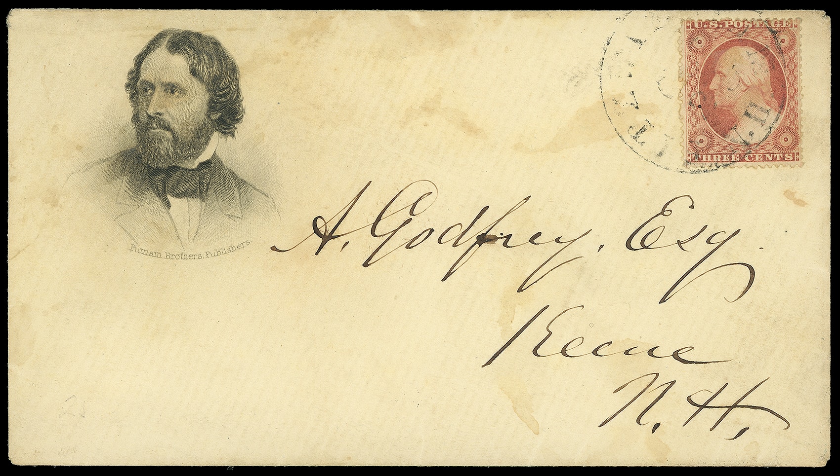 Portrait facing left with Putnam Brothers imprint on amber cover bearing 3¢ dull red (26) tied by "Fitzwilliam N.H. Oct 23" cds to Keene N.H.; light toning, F.-V.F. Milgram No. JF-3; Estimate $100 - 150. (Image1)