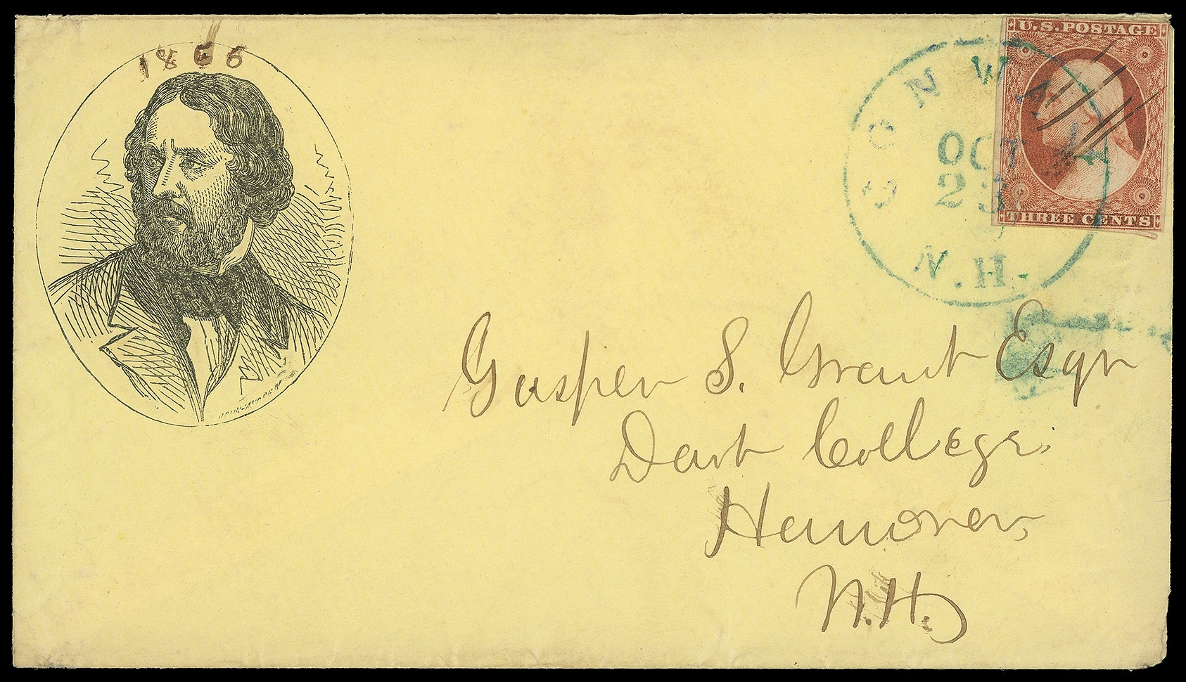 Oval portrait design with John Andrews imprint and ms. "1856" dated on yellow cover bearing 1856, 3¢ orange brown (11A var.), small tear, manuscript cancel and tied by blue "Conway N.H. Oct 23" cds to Hanover N.H.; reduced slightly at