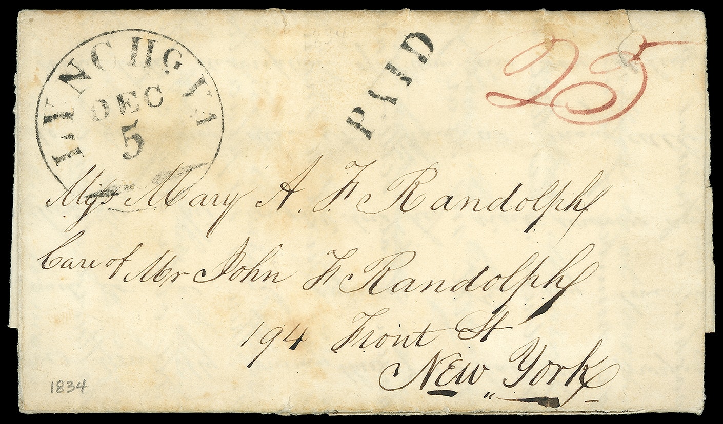 into the period - philosophical commentary, entered mails with "Lynchg. Va. Dec 5" cds with matching "Paid" handstamp and red ms. "25" rating; edge tear and wear, some splitting, F.-V.F., well written view of the period. Estimate; $150 -